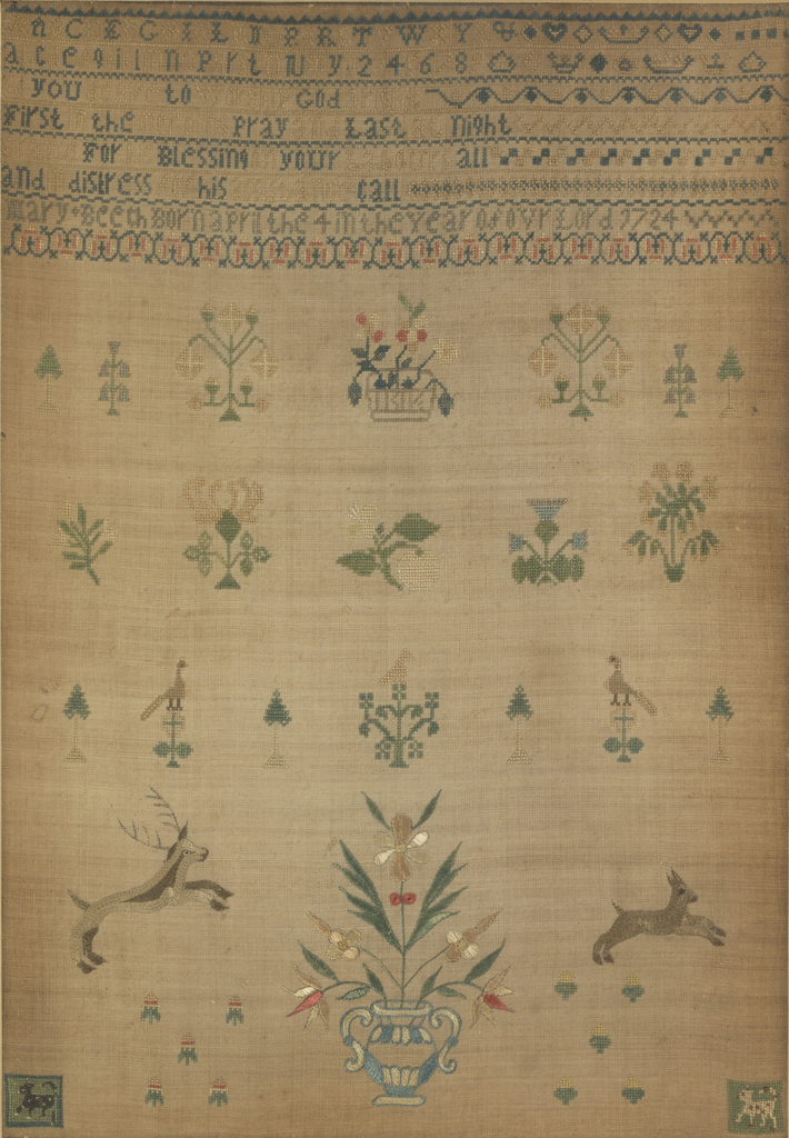 This is a Sampler. It was made by Mary Beech. It is dated ca. 1738 and we acquired it in 2003. Its medium is linen, silk and its technique is embroidered in cross-stitch and satin stitch. It is a part of the Textiles department.