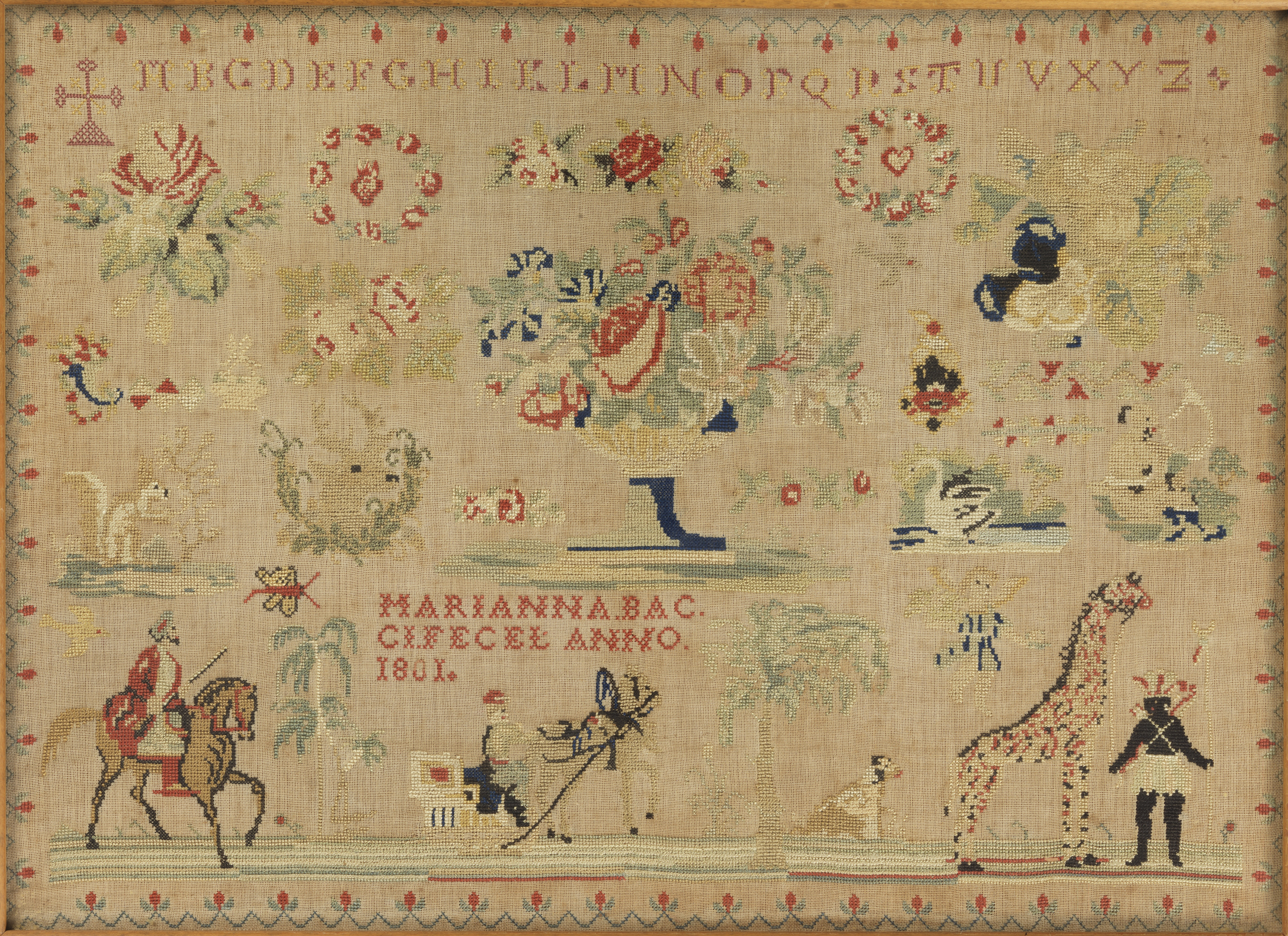 This is a Sampler. It is dated 1801 and we acquired it in 2003. Its medium is linen, silk and its technique is cross stitch embroidery. It is a part of the Textiles department.