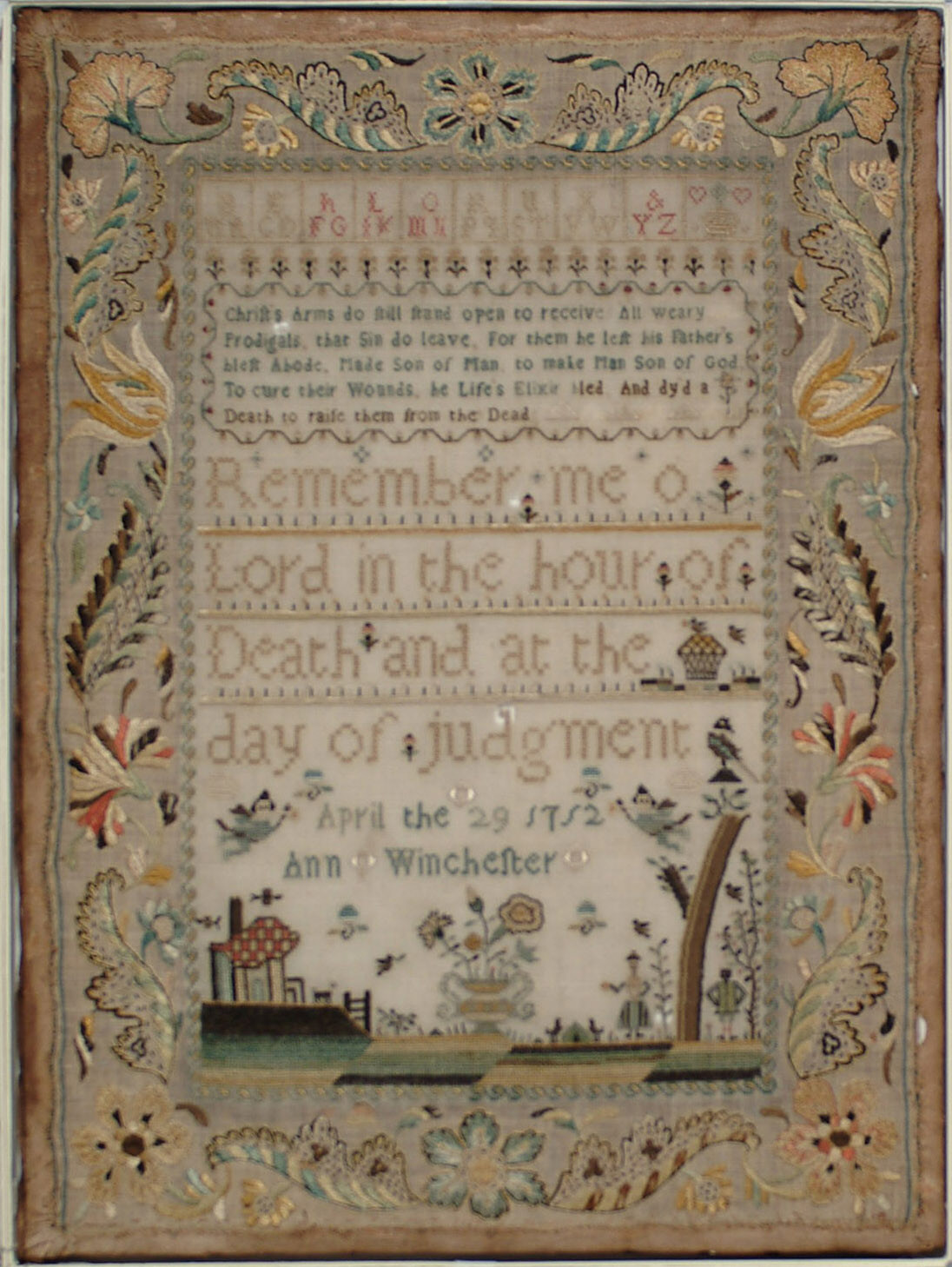 This is a Sampler. It was made by Ann Winchester. It is dated 1752 and we acquired it in 2003. Its medium is wool, silk and its technique is embroidered in eyelet, cross, stem, and satin stitches. It is a part of the Textiles department.