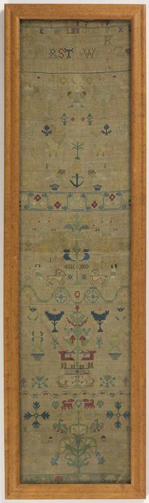 Sampler (England); Made by Elizabeth Saggar (English); linen, silk; Frame H x W x D: 88.9 x 25.4 cm (35 x 10 in.); Gift of Myra and William H. Mathers; 2003-14-33