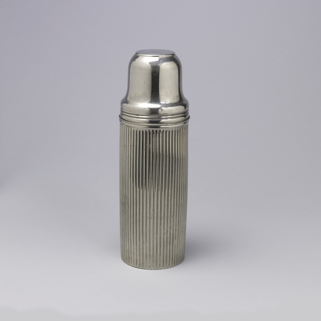 This is a Flask. It was manufactured by Landers Frary & Clark. It is dated ca. 1917 and we acquired it in 2005. Its medium is plated metal, glass, rubber. It is a part of the Product Design and Decorative Arts department.