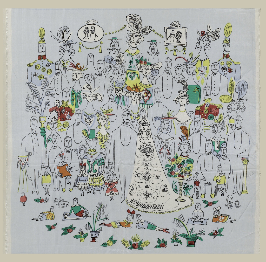 The Wedding, by Saul Steinberg, depicts a whimsical cartoon of a wedding scene with the bride and groom featured at the center surrounded by family members and children posed in the foreground. The characters are screen printed in black and multicolor on a light blue silk, plain weave ground. This textile was manufactured Piazza Prints, an independent screen printer in New York (established 1946) that produced many of Steinberg’s designs as wallcoverings, textiles, and scarves.