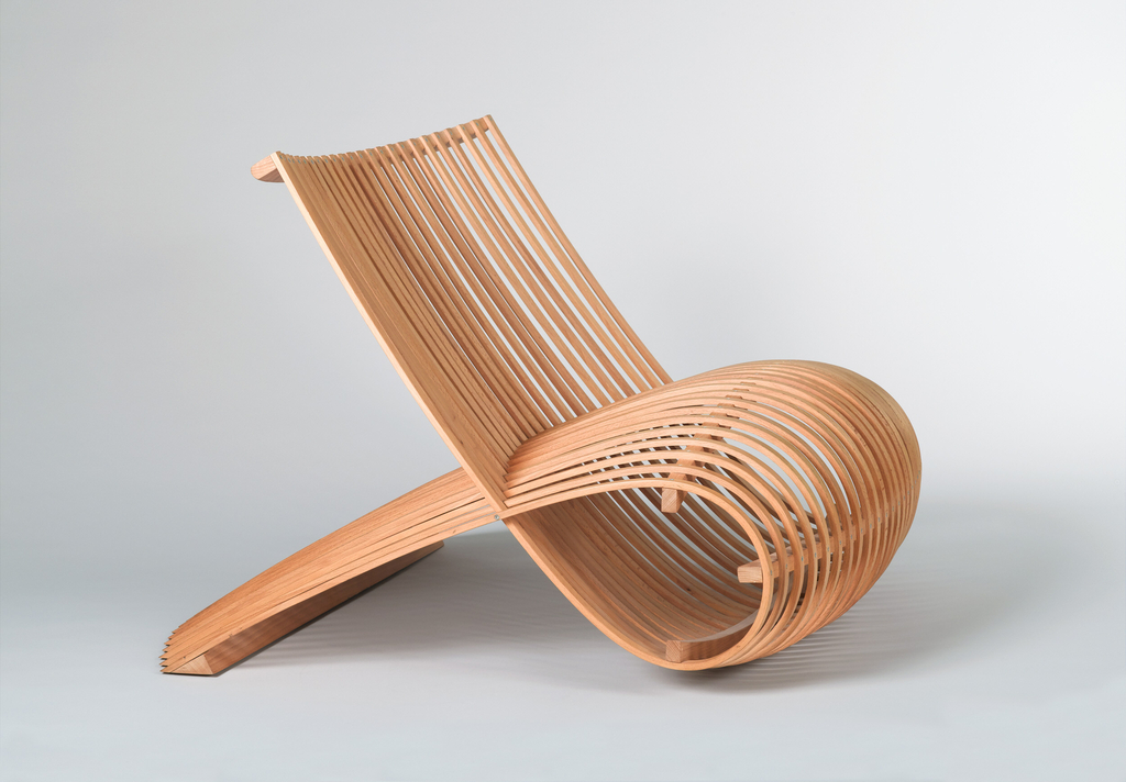 The delicate Wood chair, by noted industrial designer Marc Newson, is made from multiple long strands of beechwood and is unique in its construction. Each strip is bent back onto itself and affixed to a wooden base — there are no joints or right angles — to create a flowing, organic form. Originally created as a piece for an exhibition, the chair was put into production by the Italian design firm Capellini. Newson’s overall style is biomorphic; he designs in diverse and multiple fields, creating everything from furniture, to product design, aircraft design, and jewelry.