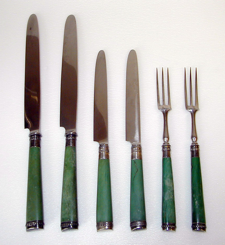 "Another way in which color came to flatware was through the use of green-stained ivory or bone on knife handles. These were popular for dessert and table knives, and sometimes used with steel-tined forks in France, England, the United States and elsewhere for much of the second half of the eighteenth and first quarter of the nineteenth centuries (fig. 70)."