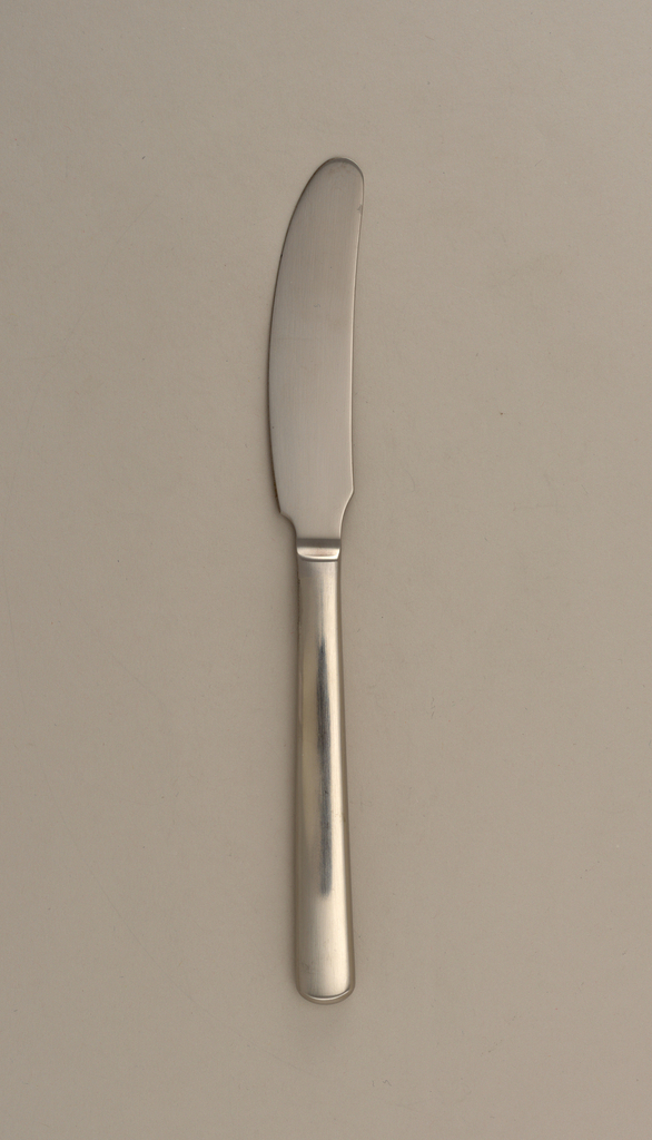 This is a Butter knife. It was designed by Kay Bojesen and manufactured by Rosendahl and made by Kay Bojesen. It is dated 1980 and we acquired it in 1992. Its medium is stainless steel. It is a part of the Product Design and Decorative Arts department.