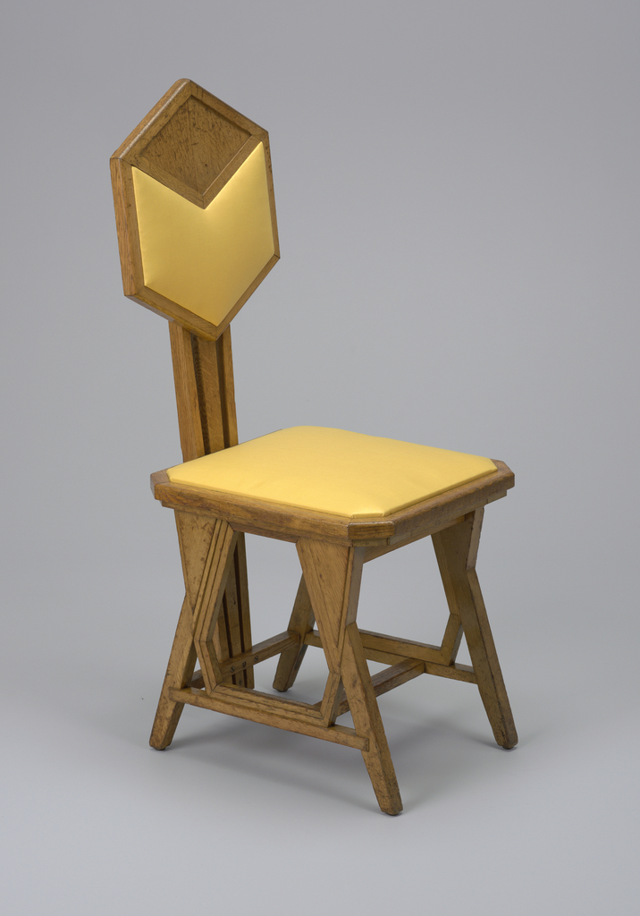 This is a side chair. It was designed by Frank Lloyd Wright. It is dated ca. 1920 and we acquired it in 1968. Its medium is oak, chintz upholstery [reproduction]. It is a part of the Product Design and Decorative Arts department.