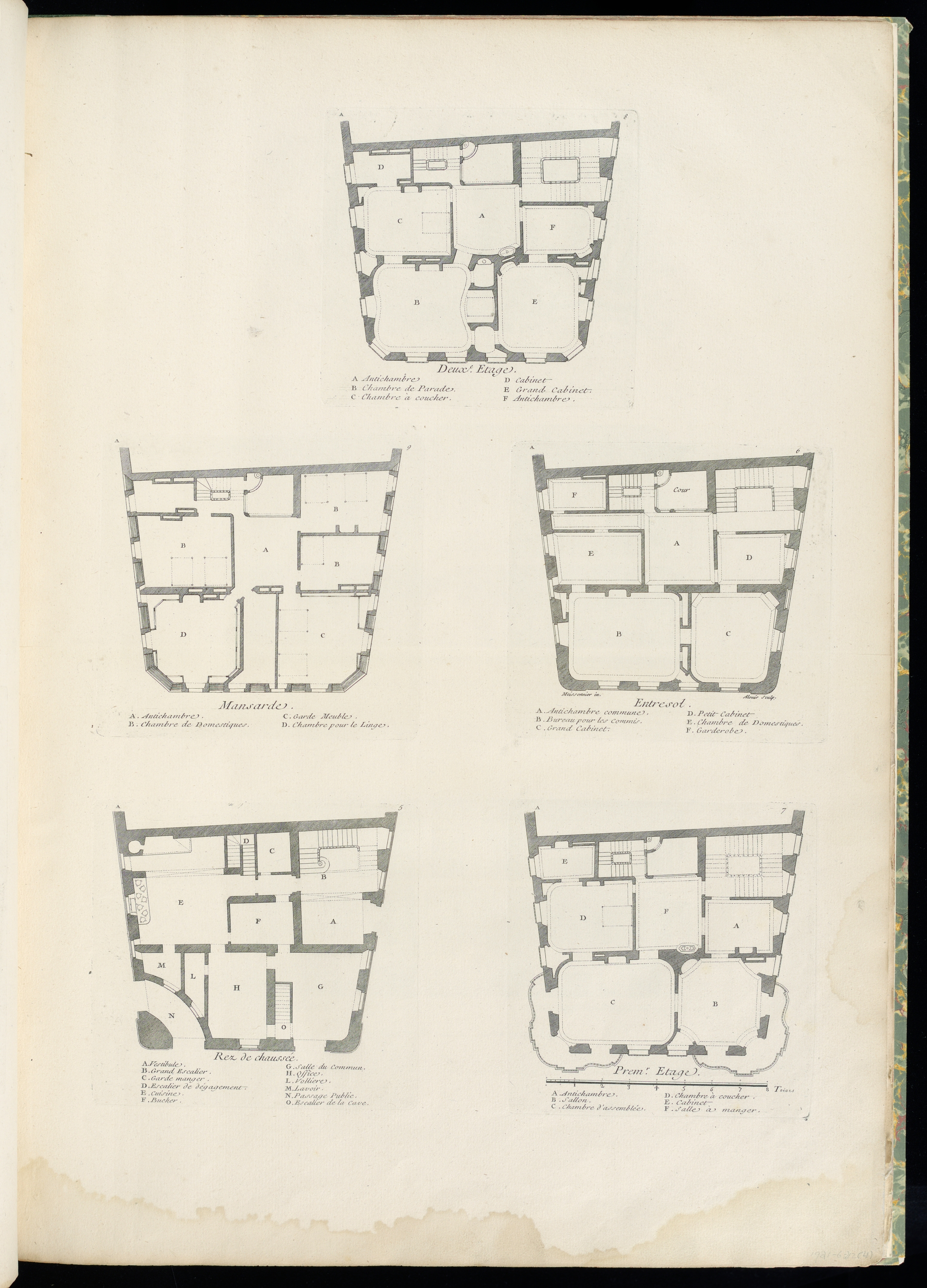 Lettered upper left in plate: A; numbered upper right in plate: 6; lettered lower center in plate: Entresol. / A. Antichambre commune. / B. Bureau pour les commis. / C. Grand Cabinet. / D. Petit Cabinet / E. Chambre de Domestiques. / F. Garderobe.