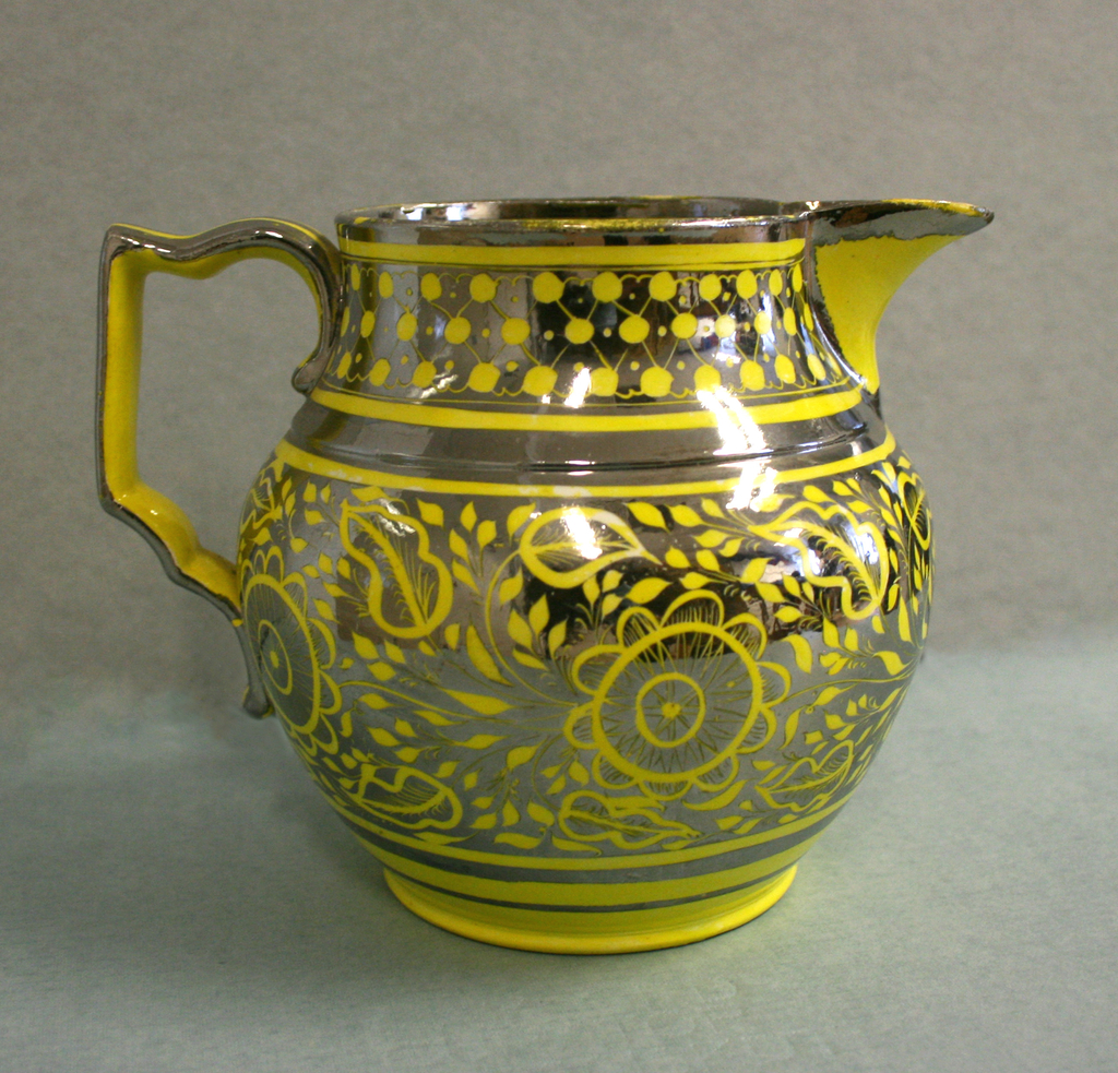 This is a Pitcher. It is dated ca. 1810 and we acquired it in 2006. Its medium is glazed earthenware, luster decoration silver resist (chipped). It is a part of the Product Design and Decorative Arts department.
