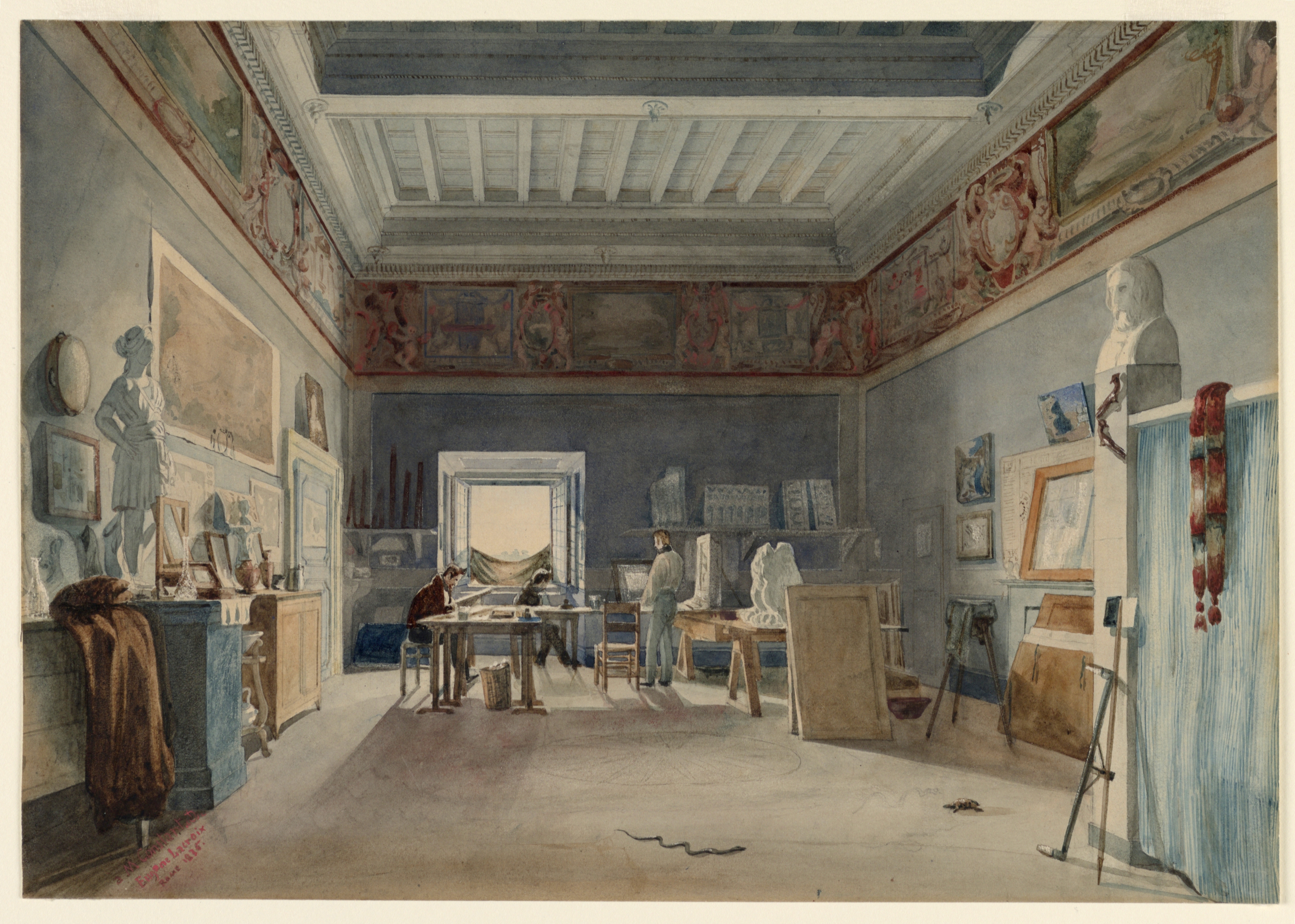 Drawing, A Studio in the Villa Medici, Rome; Attributed to Joseph-Eugène Lacroix (French, 1814 - 1873); brush and watercolor with scraping for highlights on white wove paper; Frame H x W x D: 39.7 x 50.2 x 2.5 cm (15 5/8 x 19 3/4 x 1 in.) Sheet: 22.8 x 32.9 cm (9 x 12 15/16 in.); Thaw Collection; 2007-27-15