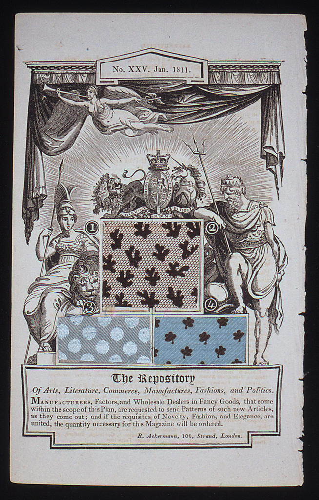 This is a Page from Ackermann's "Repository of the Arts, Science etc,". We acquired it in 1995. Its medium is paper, cotton, silk and its technique is (samples) printed plain weave; warp-faced plain weave with weft patterning; printed plain weave with twill effect. It is a part of the Textiles department.