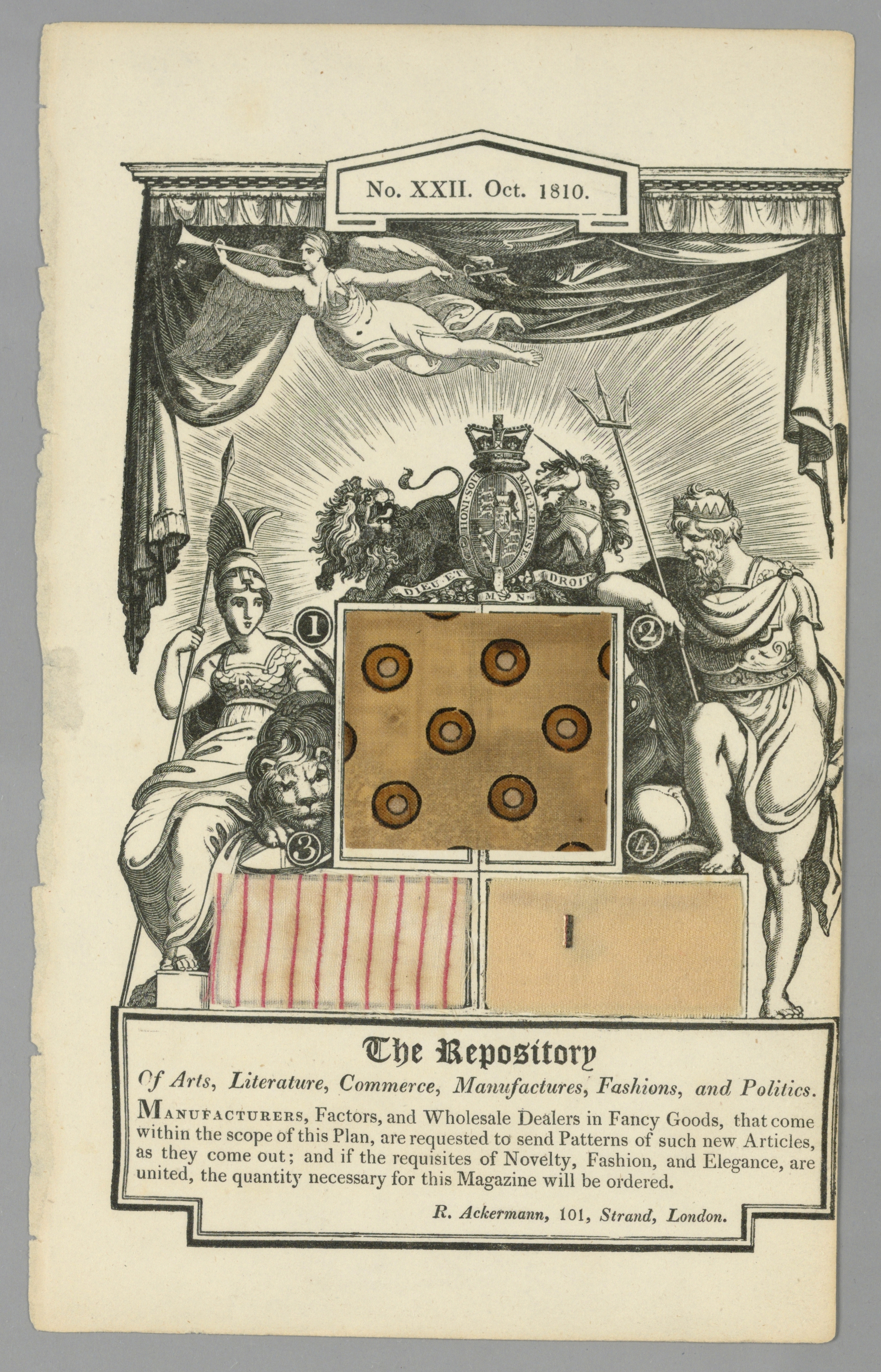 This is a Page from Ackermann's "Repository of the Arts, Science etc,". We acquired it in 1995. Its medium is k.) paper and textile swatches (fibers not identified). It is a part of the Textiles department.
