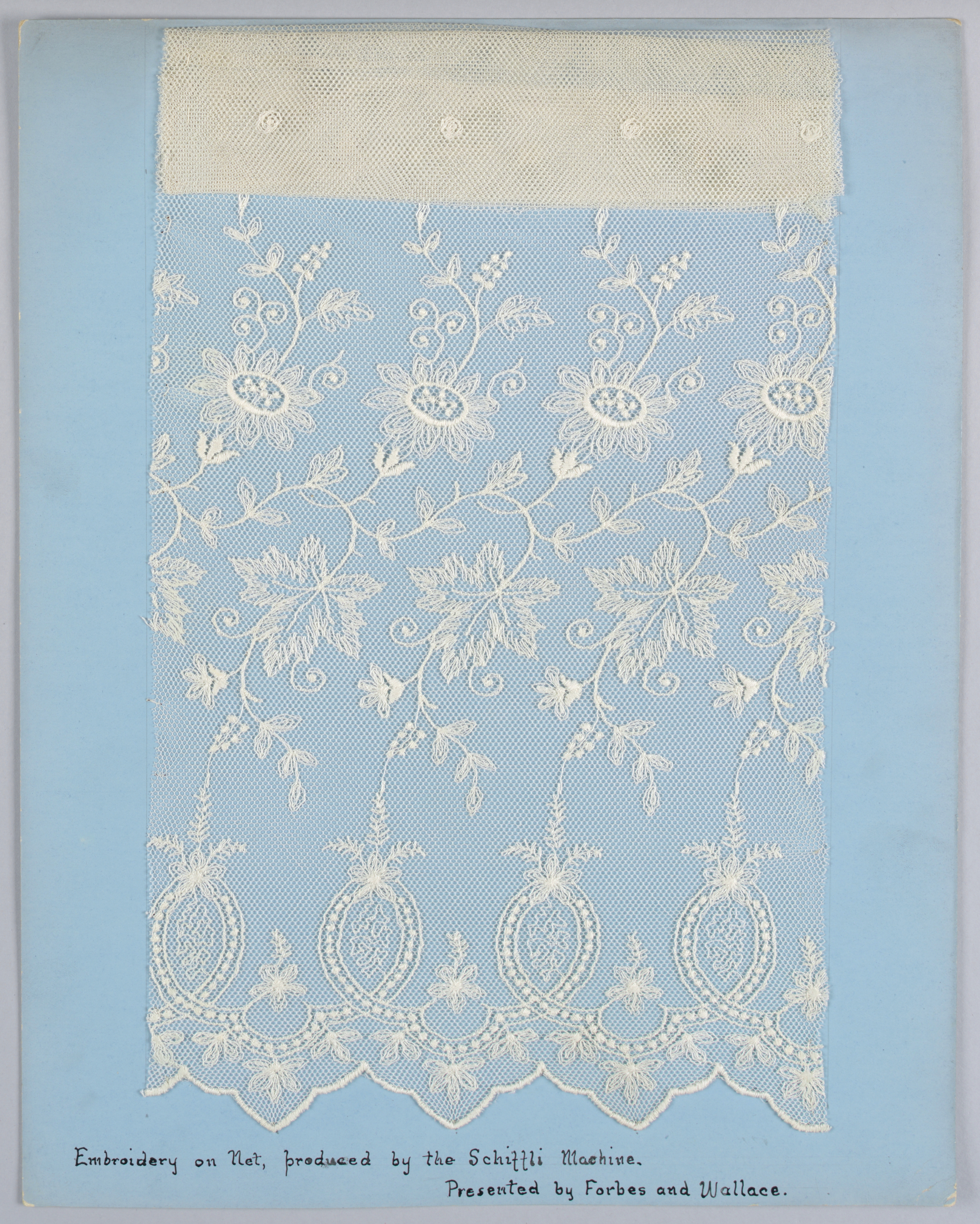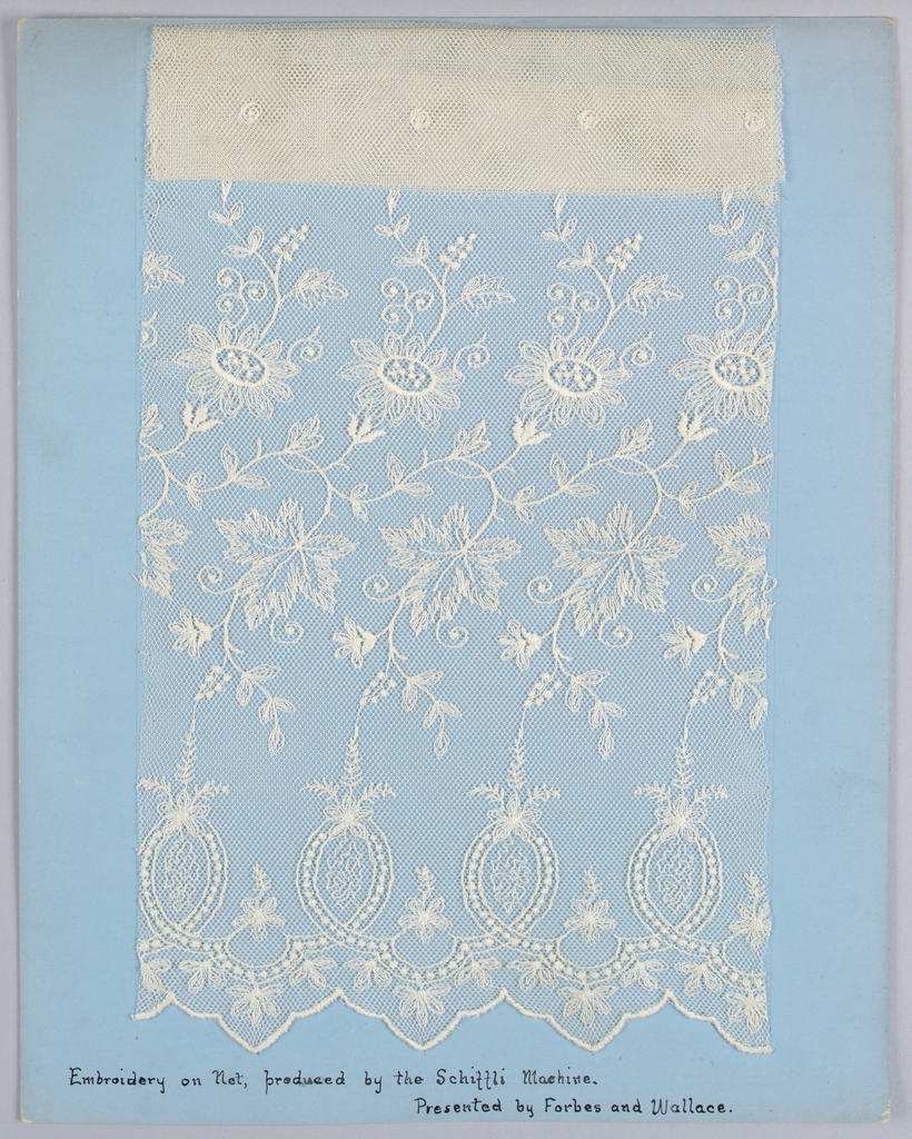 This is a Machine-made openwork samples. We acquired it in 1971. Its medium is cardboard, linen, silk, metallic and its technique is linen embroidery with ground cloth dissolved. It is a part of the Textiles department.