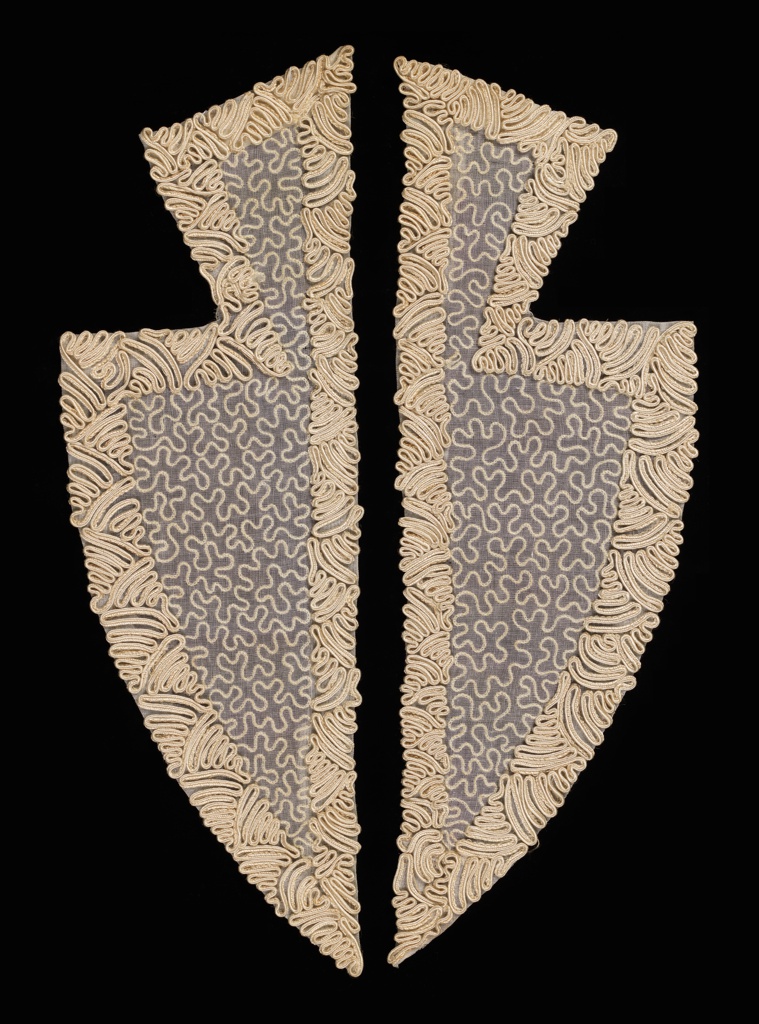 This is a Lapels. It was designed by Alberto Fasola and manufactured by Rialto Art Embroidery. It is dated ca. 1920–40 and we acquired it in 2007. Its technique is hand embroidered using couching and reverse chain stitches. It is a part of the Textiles department.