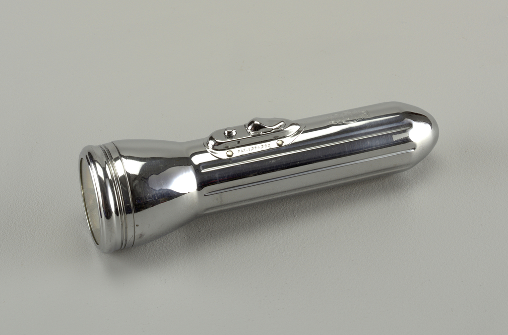 This is a flashlight. It is dated 1933 and we acquired it in 2008. Its medium is metal, plastic, glass. It is a part of the Product Design and Decorative Arts department.