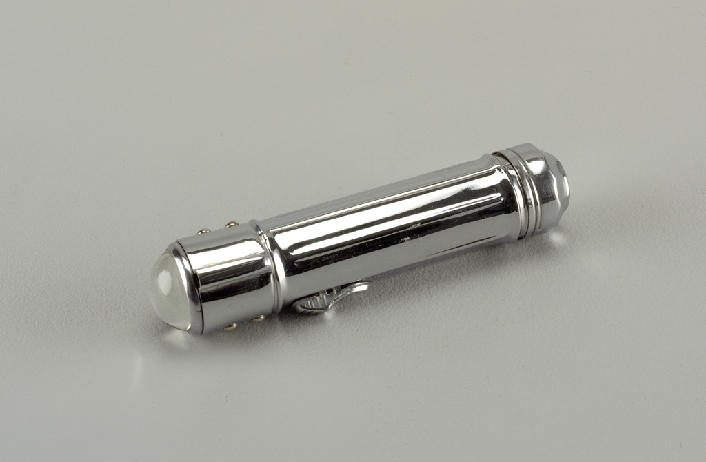 This flashlight has a convex magnifying lens. Some models came with an attachment for holding various screwdriver heads. Its date makes this an early example of a multitasking tool that combines functions for maximum efficiency.