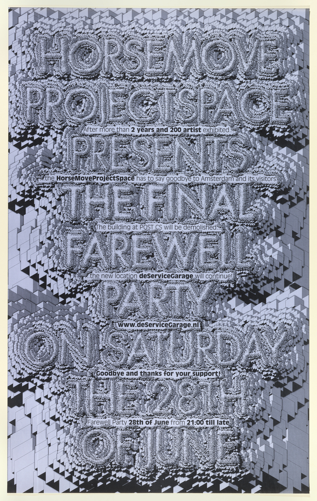Poster, HorseMoveProjectSpace Presents: The Final Farewell Party; Designed by Michiel Schuurman ((Dutch, b. 1974)); offset lithograph on white wove paper; 117.5 x 72.9 cm (46 1/4 x 28 11/16 in.); Gift of Michiel Schuurman; 2008-22-5