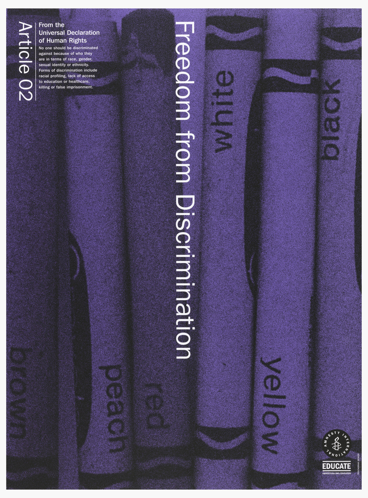 Poster, Article 02: Freedom from Discrimination; Designed by Woody Pirtle (b. 1945); Client: Amnesty International (United States); offset lithograph on white wove paper; Sheet: 61 x 45.7 cm (24 x 18 in.); Gift of Woody Pirtle; 2009-34-13