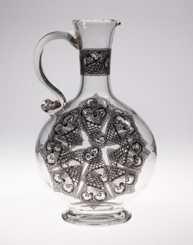 Massanetz’s water pitcher is of blown glass with applied handles. The surface is decorated with black-pen painting and gold decoration, a technique refined in Steinschönau, in northern Bohemia. The intricate, lace-inspired design radiates symmetrically from the middle of the body, creating a kaleidoscope of pattern and detail.