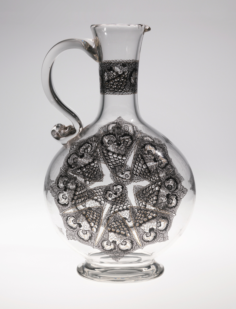 Massanetz’s water pitcher is of blown glass with applied handles. The surface is decorated with black-pen painting and gold decoration, a technique refined in Steinschönau, in northern Bohemia. The intricate, lace-inspired design radiates symmetrically from the middle of the body, creating a kaleidoscope of pattern and detail.