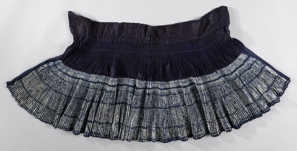 This is a Skirt. It is dated 1950–60 and we acquired it in 2009. Its medium is hemp and its technique is plain weave patterned with hand drawn starch resist, indigo dyed. It is a part of the Textiles department.