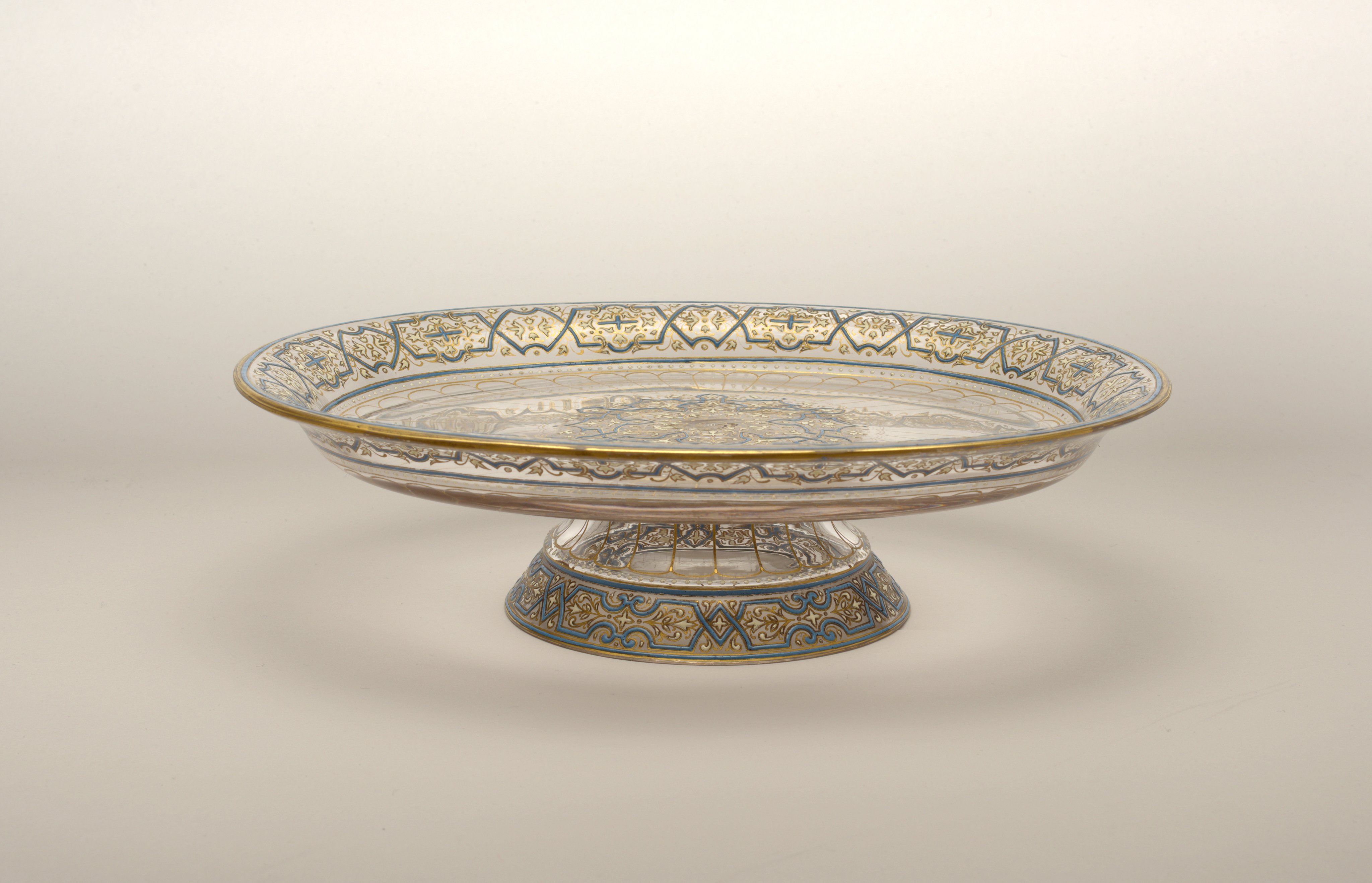 Footed Dish (Austria); Designed by Ludwig Lobmeyr (Austrian, 1829 - 1917); Manufactured by J. & L. Lobmeyr GmbH (Austria), Georg Rehlender; enameled and gilt glass; L x W x D: 24.5 x 20 x 6 cm (9 5/8 x 7 7/8 x 2 3/8 in.); Museum purchase through gift of Dale and Doug Anderson, Anonymous Donor, Arthur Liu, and Prairie Pictures, Inc. and from General Acquisitions Endowment Fund; 2009-18-160