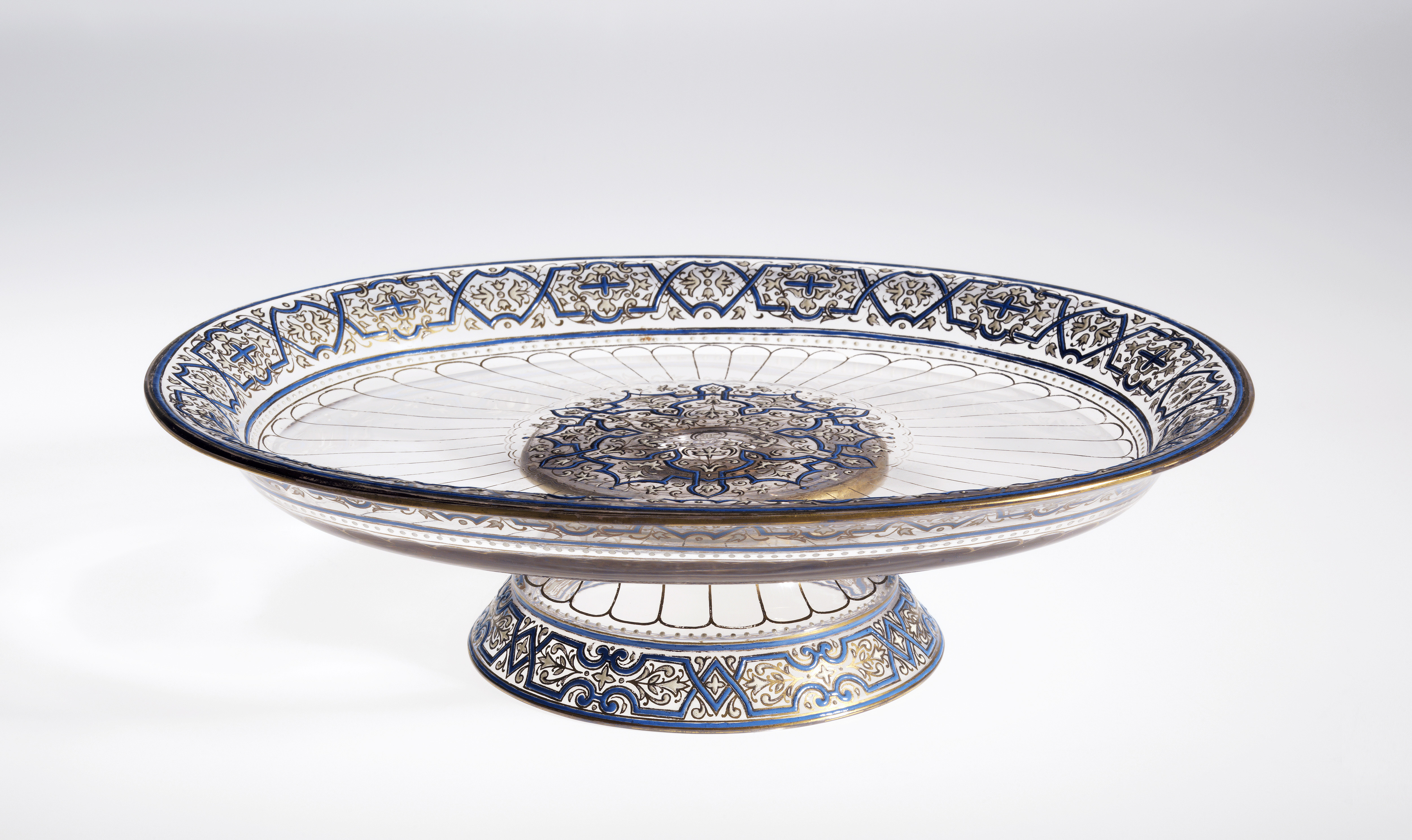 Footed Dish (Austria); Designed by Ludwig Lobmeyr (Austrian, 1829 - 1917); Manufactured by J. & L. Lobmeyr GmbH (Austria), Georg Rehlender; enameled and gilt glass; L x W x D: 24.5 x 20 x 6 cm (9 5/8 x 7 7/8 x 2 3/8 in.); Museum purchase through gift of Dale and Doug Anderson, Anonymous Donor, Arthur Liu, and Prairie Pictures, Inc. and from General Acquisitions Endowment Fund; 2009-18-160