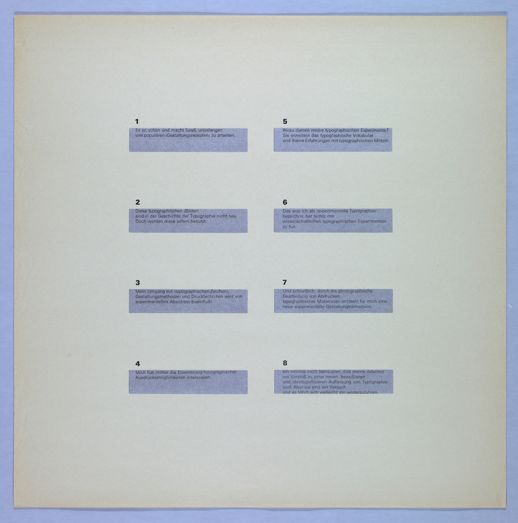 Printed in plate, in two columns, with plenty of space between: [left] 1/ Es ist schön und macht spaβ, unbefangen von populären <Gestaltungsrezepten> zu arbeiten./ 2/ Diese typographischen <bilder> sind der Geschichte der Typographie nicht neu. Doc warden diese selten benutzt./ 3/ Mein Umgang mit <typographischen Zeichen>, Gestaltungsmethoden und Drucktechniken wird von experimentellen Absichten beeinfluβt./ 4/ Mich hat immer die Erweiterung typographischer Ausdrucksmöglichkeiten interessiert./ [right] Wozu deinen meine typographischen Experimente? Sie erweitern das typographische Vokabular und meine Erfahrungen mit typographischen Mitteln./ 6/ Das was ich als <experimentelle Typographie> bezeichne, hat michts mit wissenschaftlichen typographischen Experimenten zu tun./ 7/ Und Schlie: durch die photographische Bearbeitung von Abdrucken typographischer Materialen entsteht für mich eine neue experimentelle Gestaltungsdimension./ 8/ Ich möchte nicht behaupten, daβ meine Arbeiten ein Vorstoβ zu einer neuen, bewuβteren und ideologiefreieren Auffassund von Typographie sind. Aber sie sind ein Versuch und es lohnt such vielleicht ihn weiterzuführen.