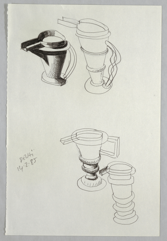 This is a Drawing. It was designed by Ettore Sottsass. It is dated February 14, 1985. Its medium is graphite on white wove paper. It is a part of the Drawings, Prints, and Graphic Design department.
