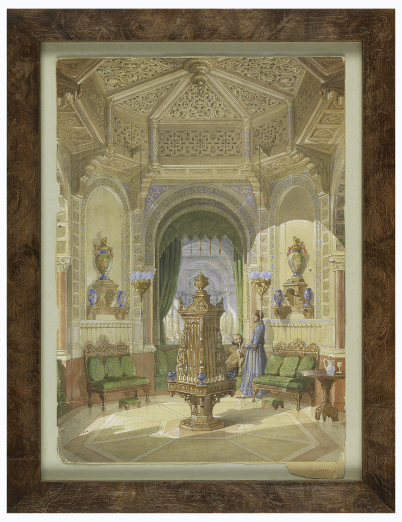In honor of the opening of Romantic Interiors, 19th Century Watercolor Interiors from the Thaw Collection at the Beijing World Art Museum on December 12, 2013 in China, Cooper-Hewitt is featuring one of the most recent gifts from Eugene and Clare Thaw to the Museum. Design for a Smoking Room by French architect and set designer Léon Feuchère (1804-1857), a recent addition to the Thaw Collection, is a relatively early example from nineteenth-century European vogue for themed domestic interiors. The scene shows an octagonal space whose walls and domed ceiling display pseudo or tromp l’oeil Moorish filigree plasterwork with arched openings presumably on four sides. The central arch leads to a receding colonnade while lateral arched niches display two large urns of Western neoclassical form with exotic painted decoration. Beneath the side niches are Turkish-style settees covered with French mid-nineteenth century fabric. A large neo-gothic pipe stand occupies the center of the kiosk and an octagonal table sits to the right. Barely noticeable amidst the room's richly patterned surfaces and furnishings is a man reclining on a central ottoman smoking a hooka, attended by a male servant to his left.