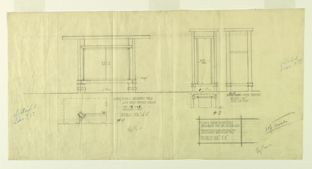 Inscribed in graphite, center: LIVING ROOM ... SECONDARY TABLE/ WITH MUSIC CABINET BELOW/ TOP 42" X 42" HEIGHT 30"/ SCALE 1 1/2" = 1' 0" (all underlined); right: HALL OPEN TABOURET/ HEIGHT 35"/ TOP 15" X 15" (all underlined); in ruled borders, lower right: LIVING ROOM FURNITURE/ DESIGNED FOR MR. H. J. ALLEN/ NIEDECKEN-WALBRIGE CO./ INTERIOR ARCHITECTS SCALE 1 1/2" = 1' 0" (all underlined); inscribed on designers: INLAY/ WOOD PANEL (all underlined); variously inscribed in graphite: #4/ O.K./ 1 of these/ #3 (all underlined); in blue graphite, left and right: detailed Dec. 7, '17 (all underlined)