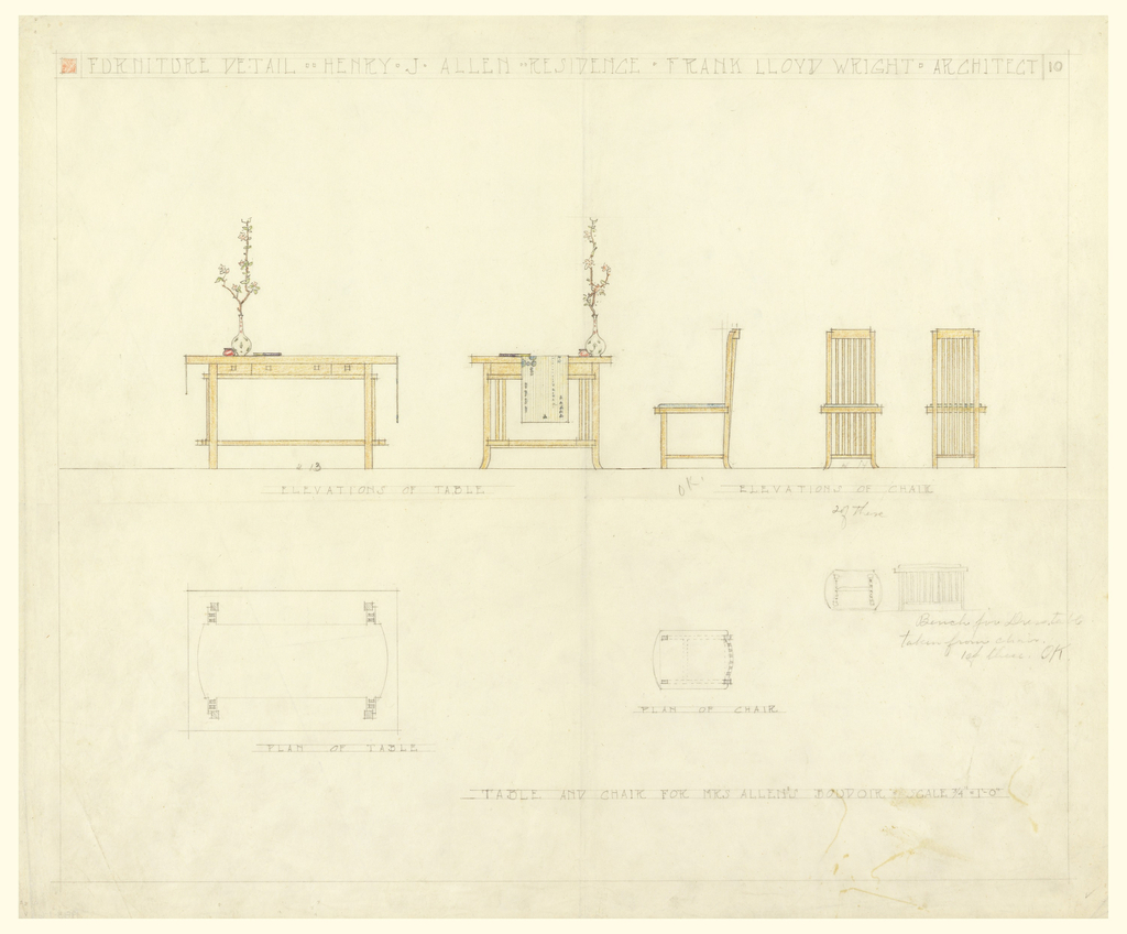 Inscribed in graphite between two ruled lines, above with red square, left: FURNITURE DETAIL. HENRY J. ALLEN . RESIDENCE. FRANK LLOYD WRIGHT. ARCHITECT10; center: # 13/ ELEVATIONS OF TABLE/ OK. ELEVATIONS OF CHAIR/ #14/ 2 of these/ PLAN OF TABLE/ PLAN OF CHAIR; Bench for Dress table/taken from chair. /1 of these OK; lower right: TABLE AND CHAIR FOR MRS. ALLEN'S BOUDOIR. SCALE 3/4" = 1'0"