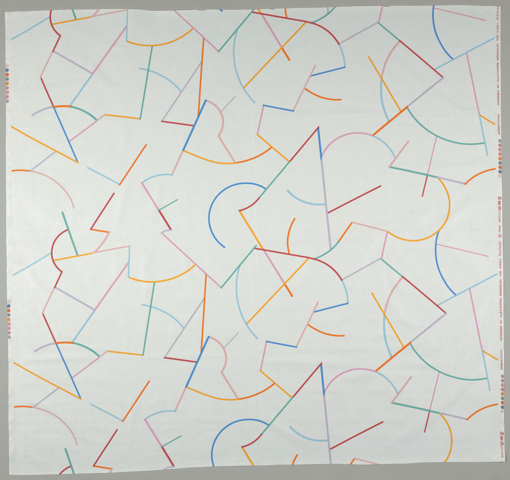 This is a Textile. It was designed by Alexandre Mimoglou and produced by Knoll International, European Textile Collection. It is dated 1982 and we acquired it in 1983. Its medium is cotton and its technique is screen printed on plain weave and glazed. It is a part of the Textiles department.