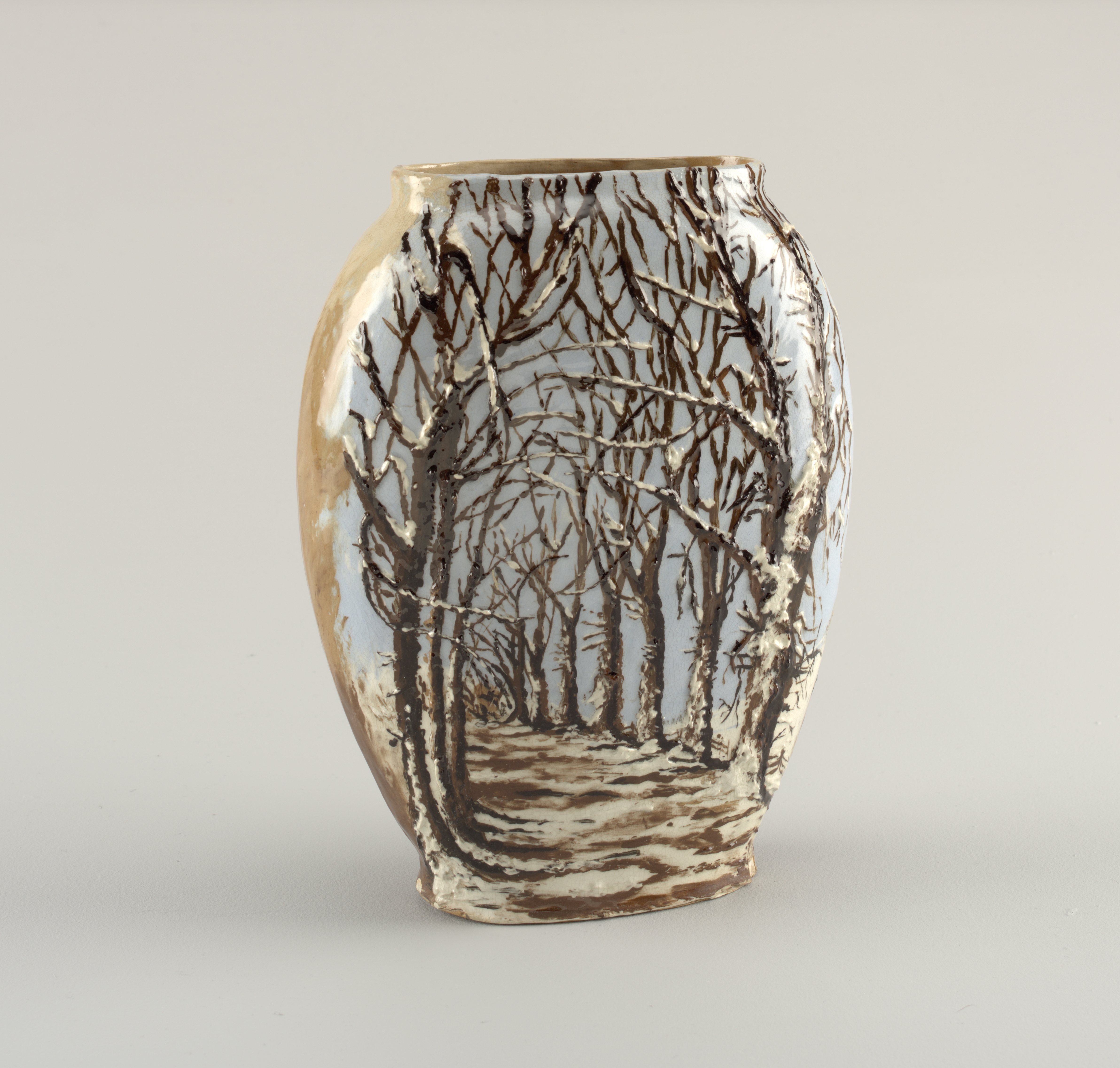 Vase Vase; Decorated by Caroline Virginia (Rich) McGuffey (American, 1839 – 1905); Manufactured by Rookwood Pottery (United States); USA; earthenware; H x W x D: 26 × 19.7 × 8.2 cm (10 1/4 × 7 3/4 × 3 1/4 in.); Gift of Dona Guimaraes in memory of Sarah McGuffey; 1983-43-1