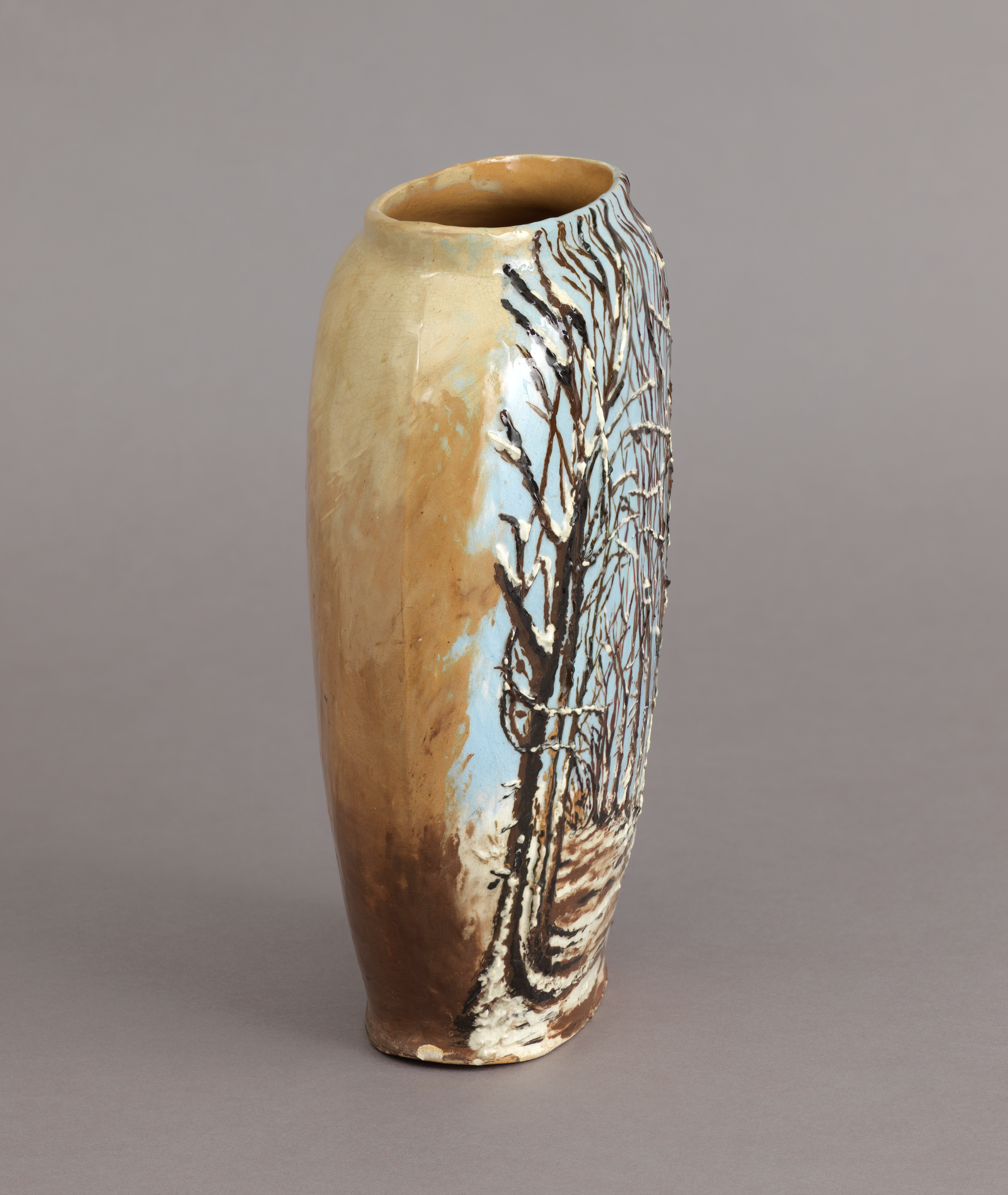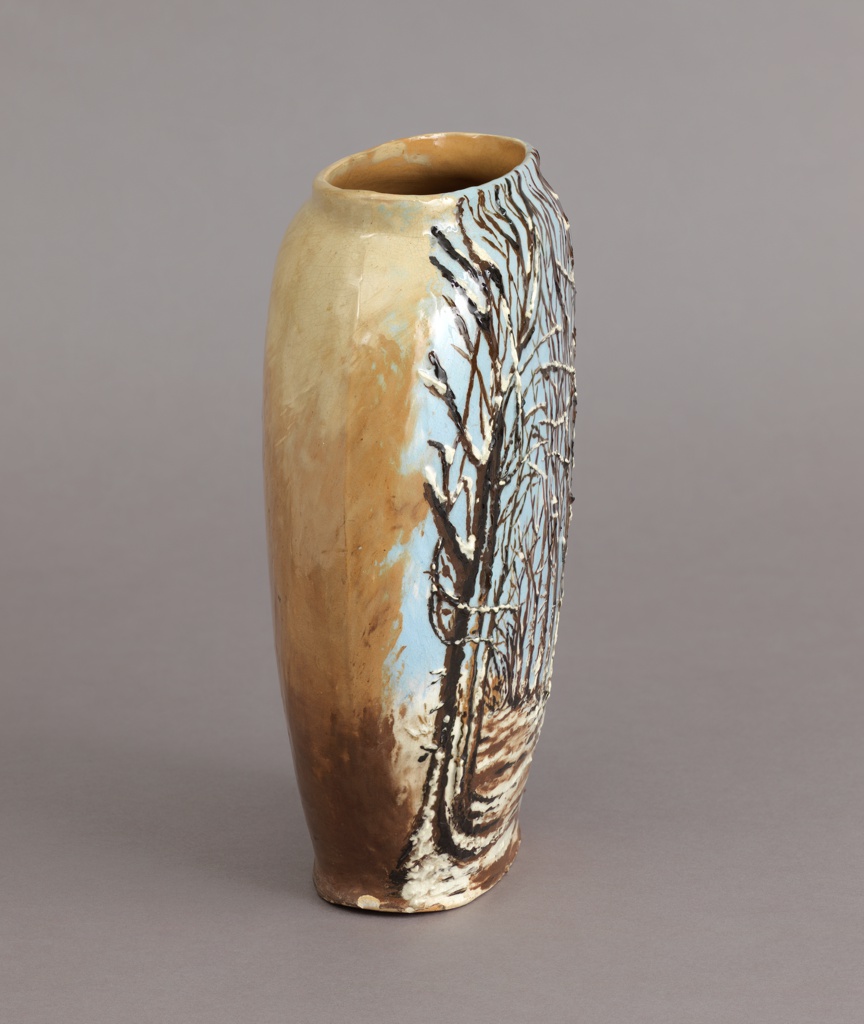 Vase Vase; Decorated by Caroline Virginia (Rich) McGuffey (American, 1839 – 1905); Manufactured by Rookwood Pottery (United States); USA; earthenware; H x W x D: 26 × 19.7 × 8.2 cm (10 1/4 × 7 3/4 × 3 1/4 in.); Gift of Dona Guimaraes in memory of Sarah McGuffey; 1983-43-1