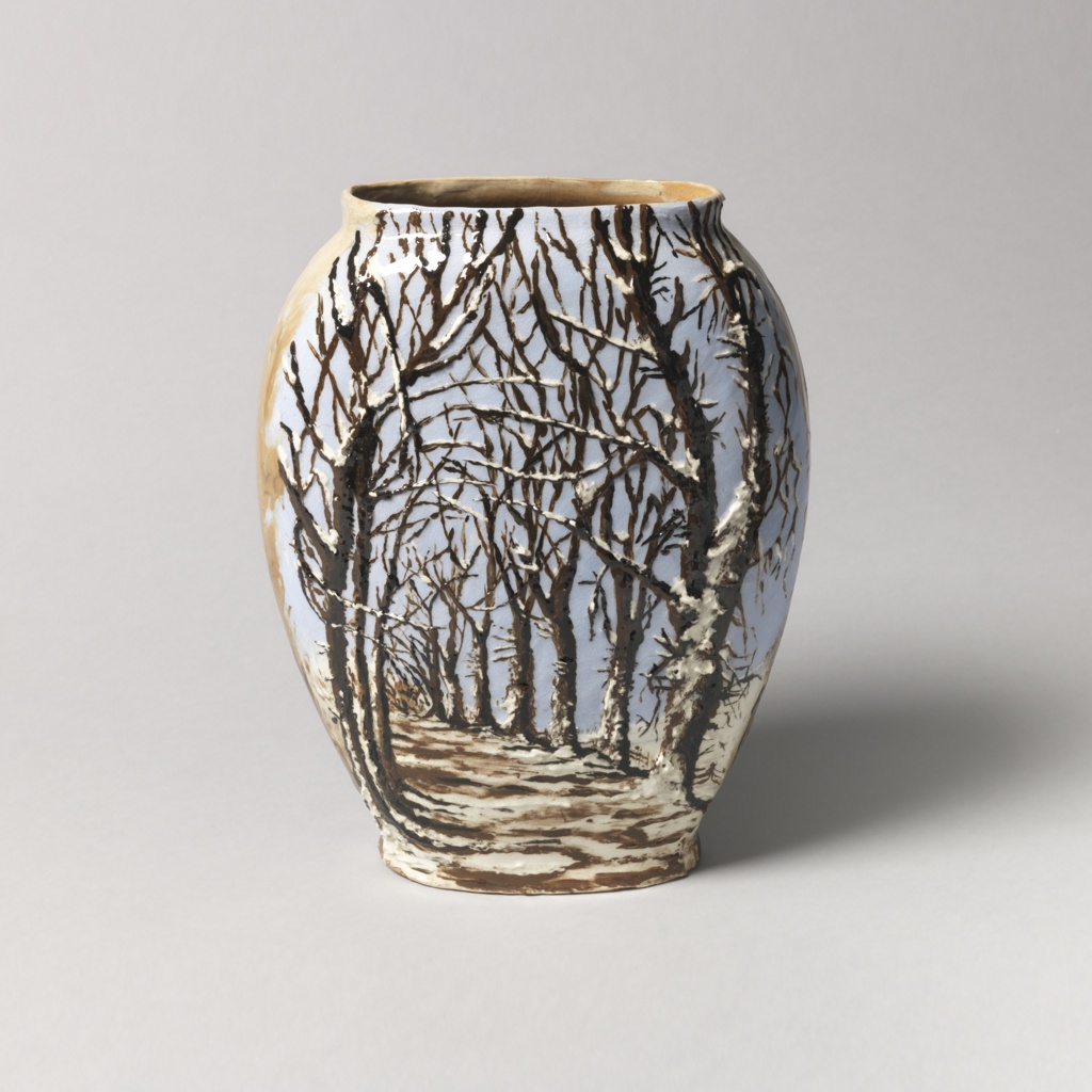 Vase Vase; Decorated by Caroline Virginia (Rich) McGuffey (American, 1839 – 1905); Manufactured by Rookwood Pottery (United States); USA; earthenware; H x W x D: 26 × 19.7 × 8.2 cm (10 1/4 × 7 3/4 × 3 1/4 in.); Gift of Dona Guimaraes in memory of Sarah McGuffey; 1983-43-1