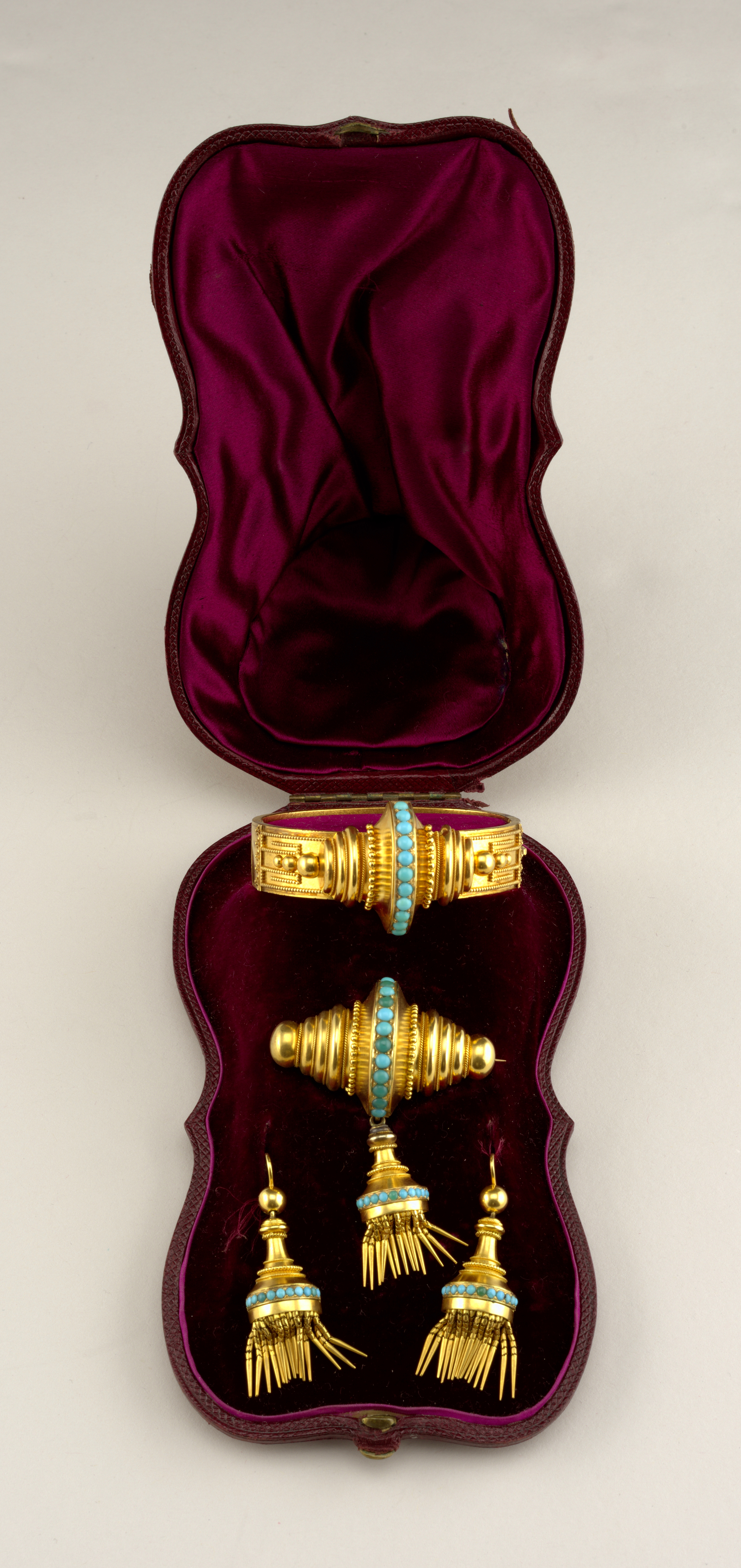 This is a Earrings, bracelet and brooch. It is dated ca. 1870 and we acquired it in 1983. Its medium is gold, turquoise. It is a part of the Product Design and Decorative Arts department.