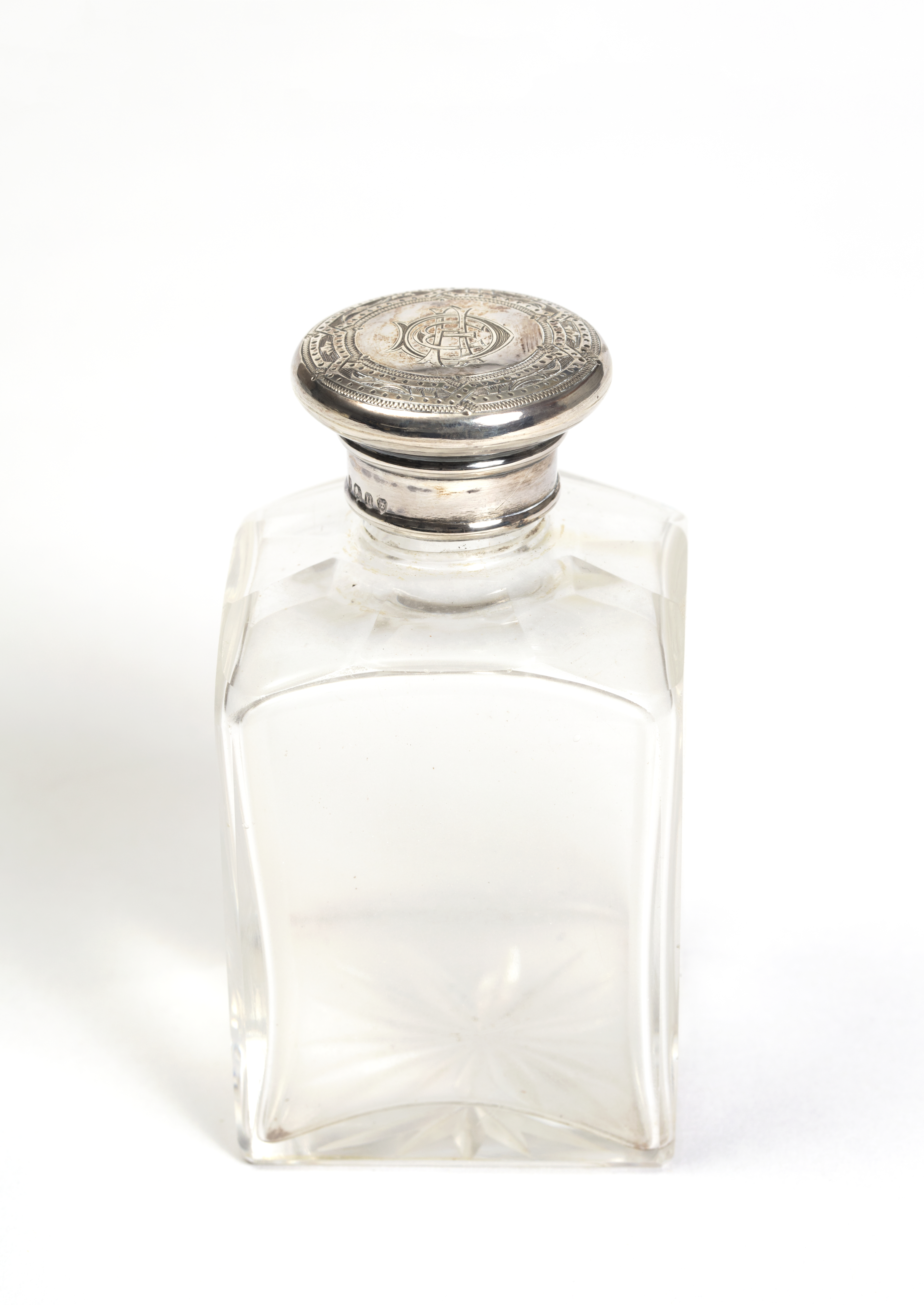 Perfume Bottle from Traveling Dressing Case Bottle; Made by Asprey & Son Co. (United Kingdom), Thomas Whitehouse (British, active 1848-98); England; glass, silver; H x W x D: 9.2 × 5 × 5 cm (3 5/8 × 1 15/16 × 1 15/16 in.); Gift of Danny J. H. Kauffman; 1984-133-5-a,b