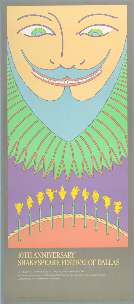 Poster, 10th Anniversary, Shakespeare Festival of Dallas; Designed by Woody Pirtle (b. 1945); USA; lithograph on paper; 97.6 x 41.9 cm (38 7/16 x 16 1/2 in.); 1984-22-1