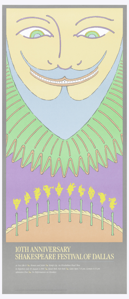 Poster, 10th Anniversary, Shakespeare Festival of Dallas; Designed by Woody Pirtle (b. 1945); USA; lithograph on paper; 97.6 x 41.9 cm (38 7/16 x 16 1/2 in.); 1984-22-1