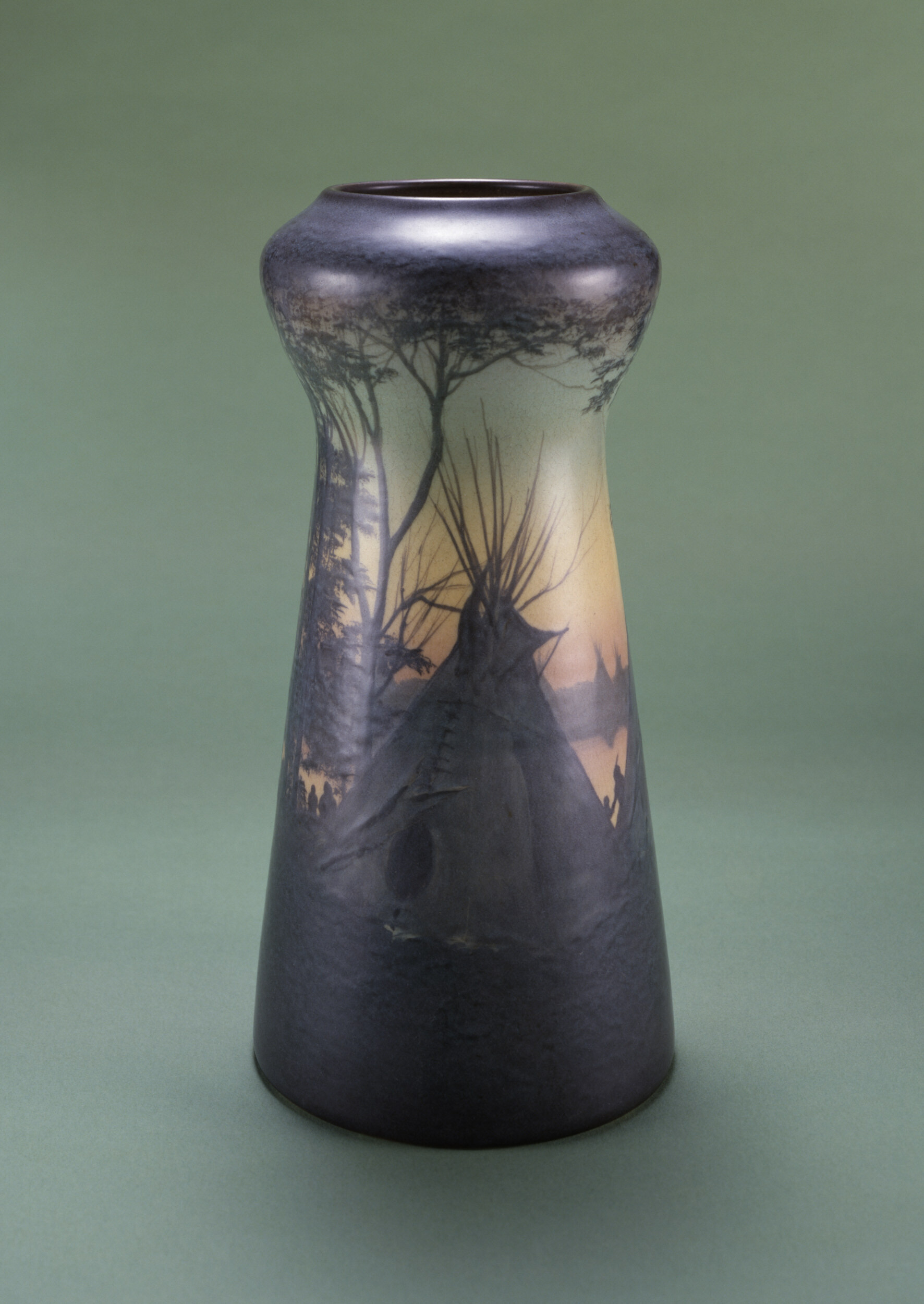 The romance of the unsullied outdoors visible on this vase was part of a romantic vision of the American frontier that still bore the imprint of Jean-Jacques Rousseau’s appreciation of the American Indian of a century earlier as the “noble savage." At the time this vase was produced—around the turn of the nineteenth and twentieth centuries—captains of industry and those truly appreciative of the need for preservation were creating large “camps” in the Adirondacks, but building log structures with many gilded age creature comforts, and buying up large tracts of land to preserve them from the ever encroaching industrialized world. These large tracts are responsible for the preservation to this day of views that might look like the one depicted on the vase, but “Indian” Reservations were not often left to the tribes to stay in their natural state. Thus the irony is that the type of Indian Encampment seen in the vase was already becoming less likely than an encampment of people who wanted to re-create an “Indian” way of life as a vacation style.