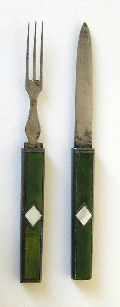 This is a knife. It was manufactured by John Wilson & Sons. It is dated ca. 1790 and we acquired it in 1985. Its medium is green-stained ivory, pewter, steel, mother-of-pearl. It is a part of the Product Design and Decorative Arts department.
