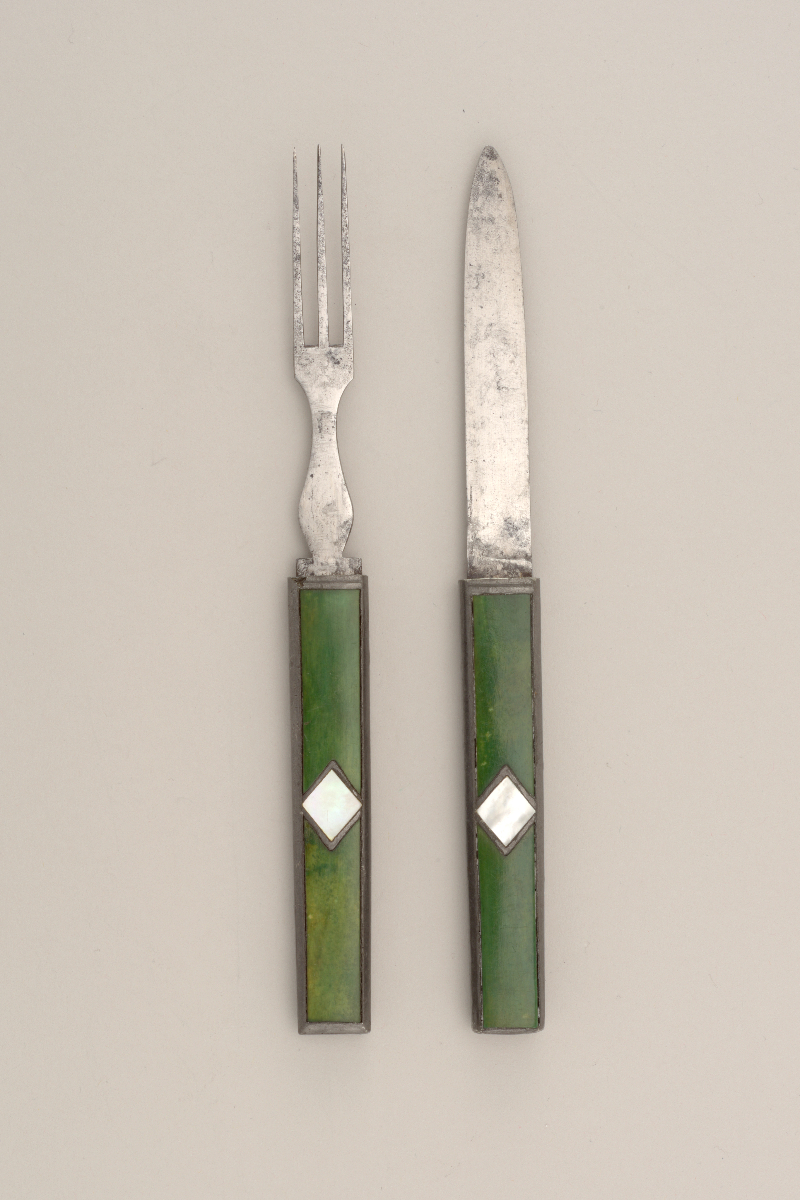 Etui Fork with Green-stained Ivory and Mother-of-Pearl Handle Etui Fork; probably Germany; green-stained ivory, pewter, steel, mother-of-pearl; L x W x D: 18.4 × 1.7 × 1.2 cm (7 1/4 × 11/16 × 1/2 in.); The Robert L. Metzenberg Collection, gift of Eleanor L. Metzenberg; 1985-103-133-b