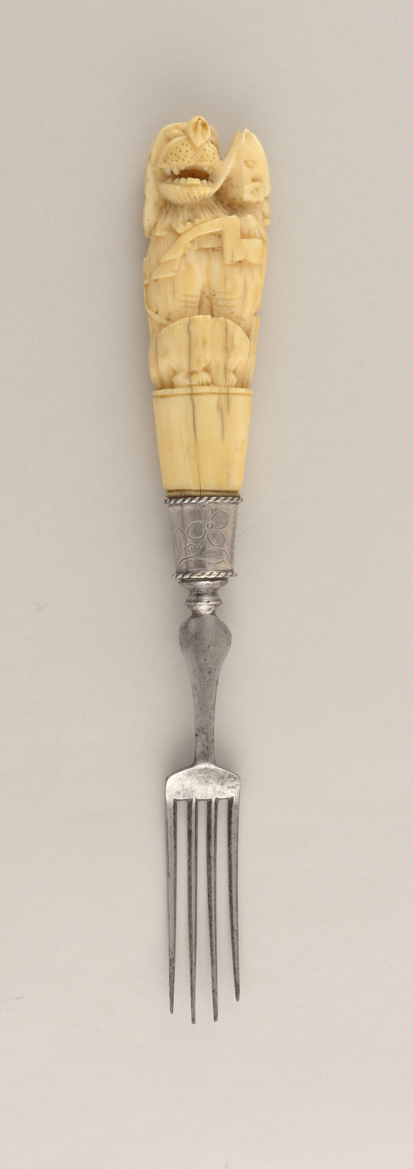 This is a fork. It was manufactured by Herder. It is dated ca. 1690 and we acquired it in 1985. Its medium is ivory, steel, silver. It is a part of the Product Design and Decorative Arts department.