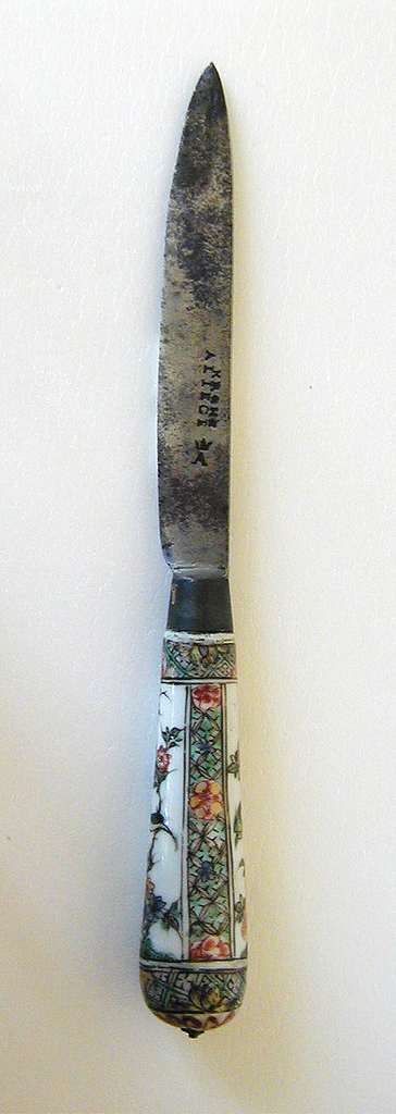 This is a knife. It is dated handle: 1662–1722; blade: early 18th century and we acquired it in 1985. Its medium is porcelain, gold, steel, silver. It is a part of the Product Design and Decorative Arts department.