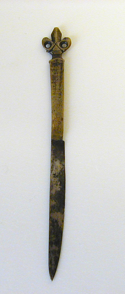 This is a knife. It is dated early 16th century and we acquired it in 1985. Its medium is steel, brass. It is a part of the Product Design and Decorative Arts department.