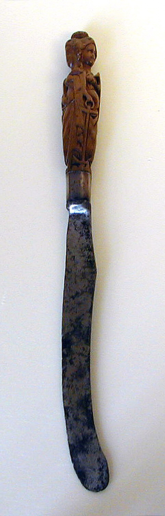 The blade of this scimitar-shaped knife reflects the great changes the utensil underwent during the seventeenth century. Knives went from being double-bladed to having a single cutting edge and a rounded, unthreatening tip. This occurred in response to the rising popularity of the fork.