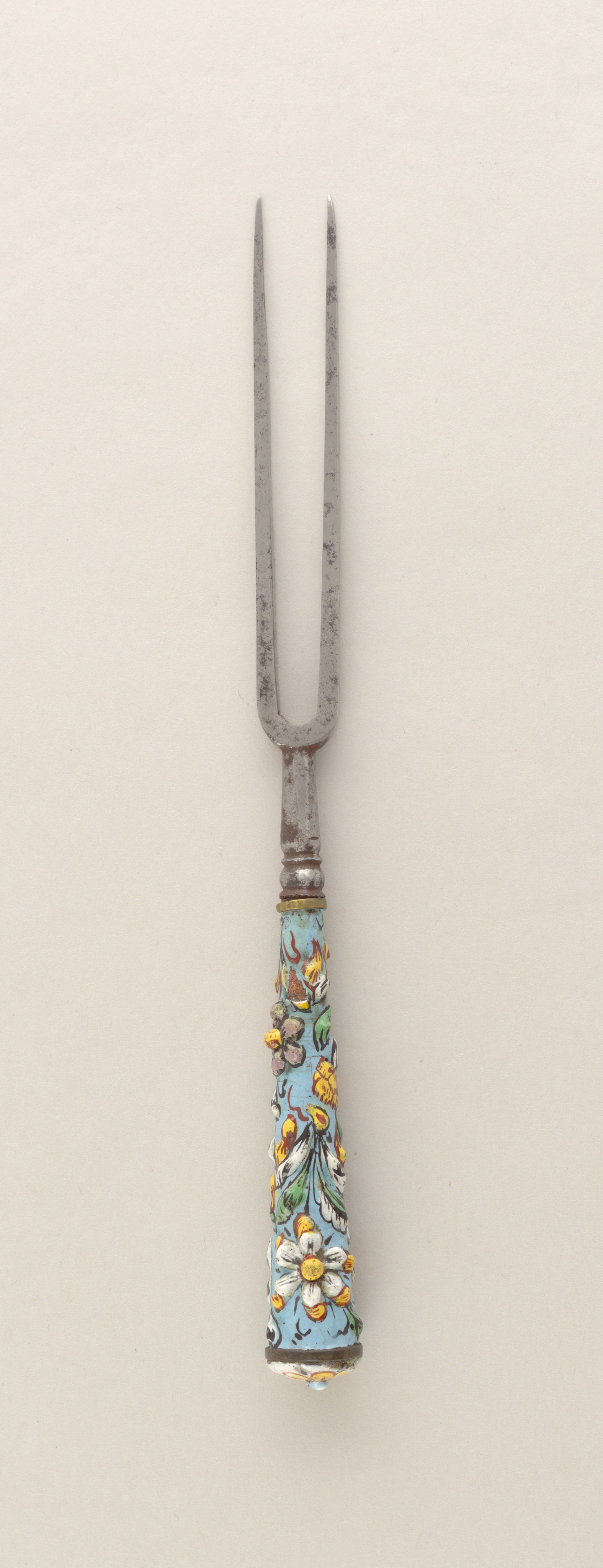 This is a fork. It is dated 1660–80 and we acquired it in 1985. Its medium is steel, enamel. It is a part of the Product Design and Decorative Arts department.