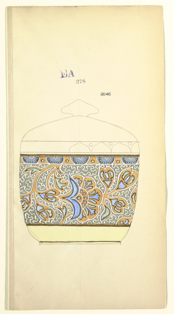Drawing, Design for a Sugar Bowl; Made for Noritake; Japan; brush and gouache, watercolor, pen and black ink, graphite on cream paper; 29.3 x 15.1 cm (11 9/16 x 5 15/16 in.) Mat: 35.7 x 45.8 cm (14 1/16 x 18 1/16 in.); 1985-14-24