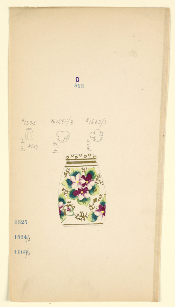 This is a Drawing. It was made for Noritake. It is dated 1880–1910 and we acquired it in 1985. Its medium is brush and watercolor, gold gouache, graphite on cream paper. It is a part of the Drawings, Prints, and Graphic Design department.