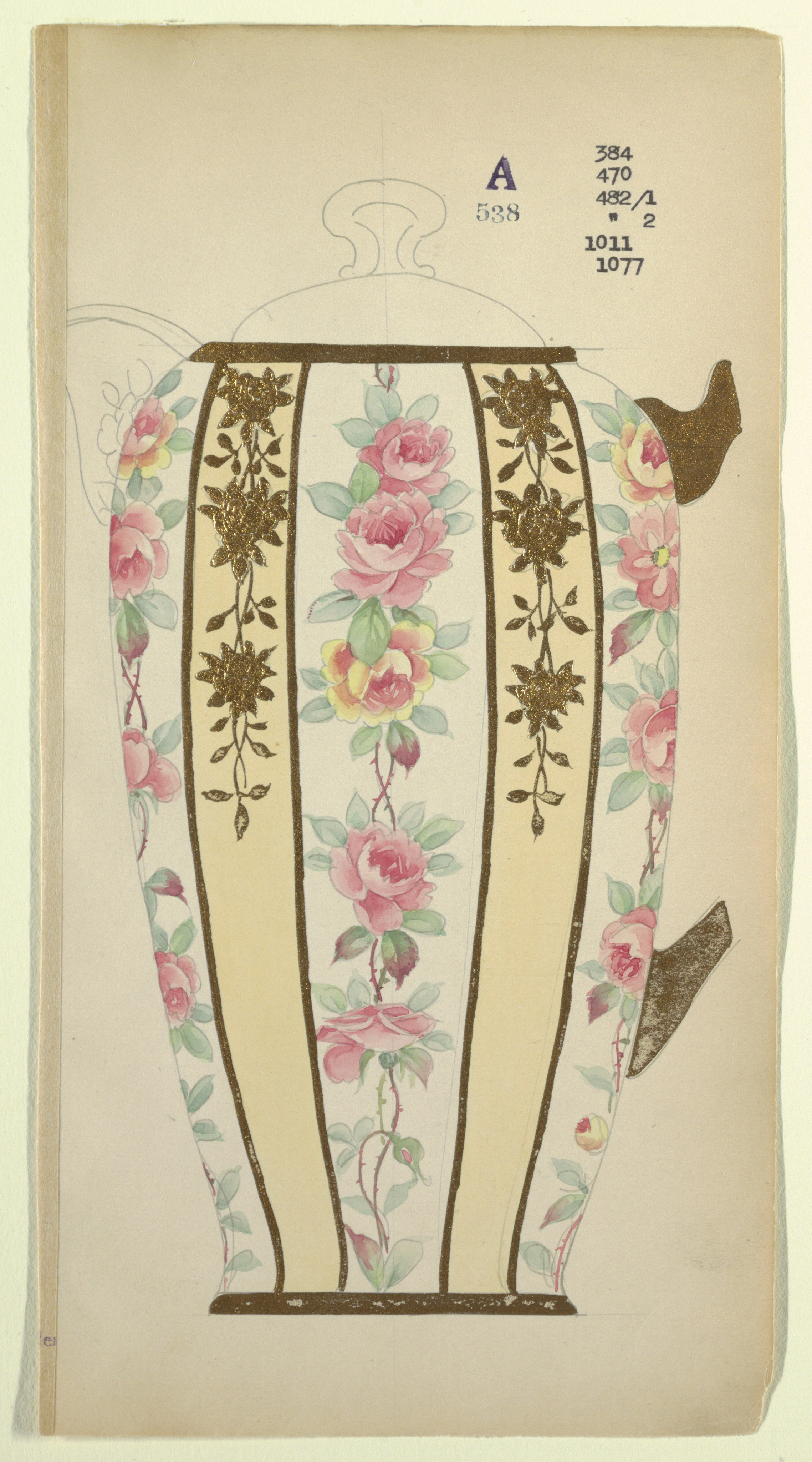 Drawing, Design for a Milk Pitcher; Made for Noritake; Japan; brush and watercolor, gold gouache, graphite on cream paper; 29.2 x 15.4 cm (11 1/2 x 6 1/16 in.) Mat: 35.7 x 45.8 cm (14 1/16 x 18 1/16 in.); 1985-14-35